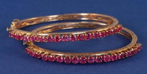 PAIR OF 14K GOLD BRACELETS SET WITH RUBIES 60mm diameter<BR><BR><BR>Packing and Shipping: $10