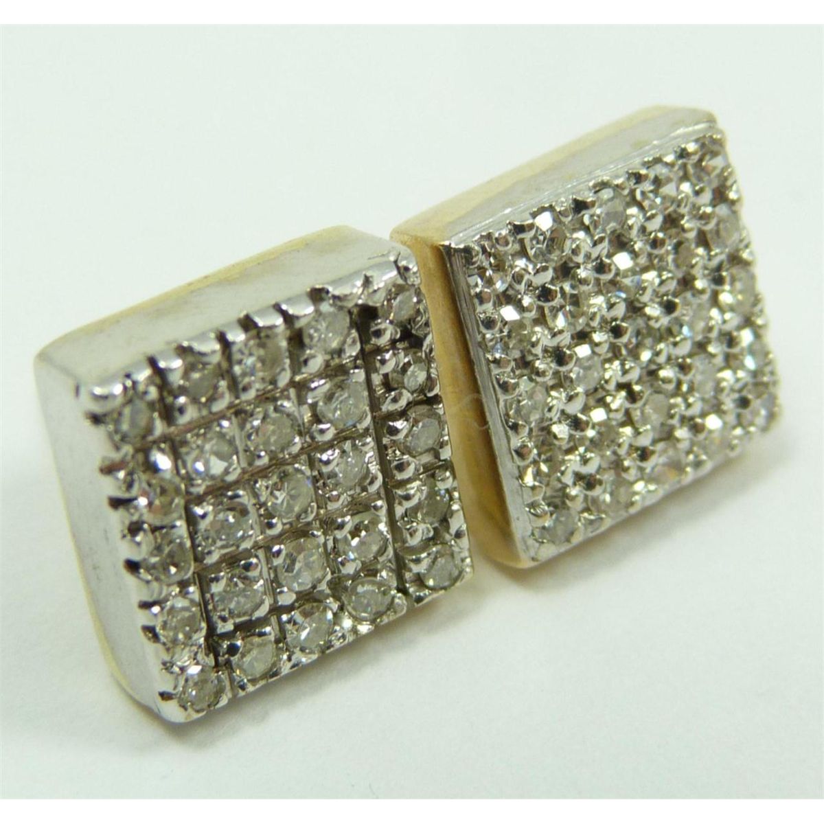 A pair of 14k yellow gold and diamond earrings. Each having a square form and holding a total of 50 round cut diamonds approx. 1.00ctw. Each measures approx. 3/8" legth x 3/8" width (1cm x 1cm). Total weight of 2.7dwt.