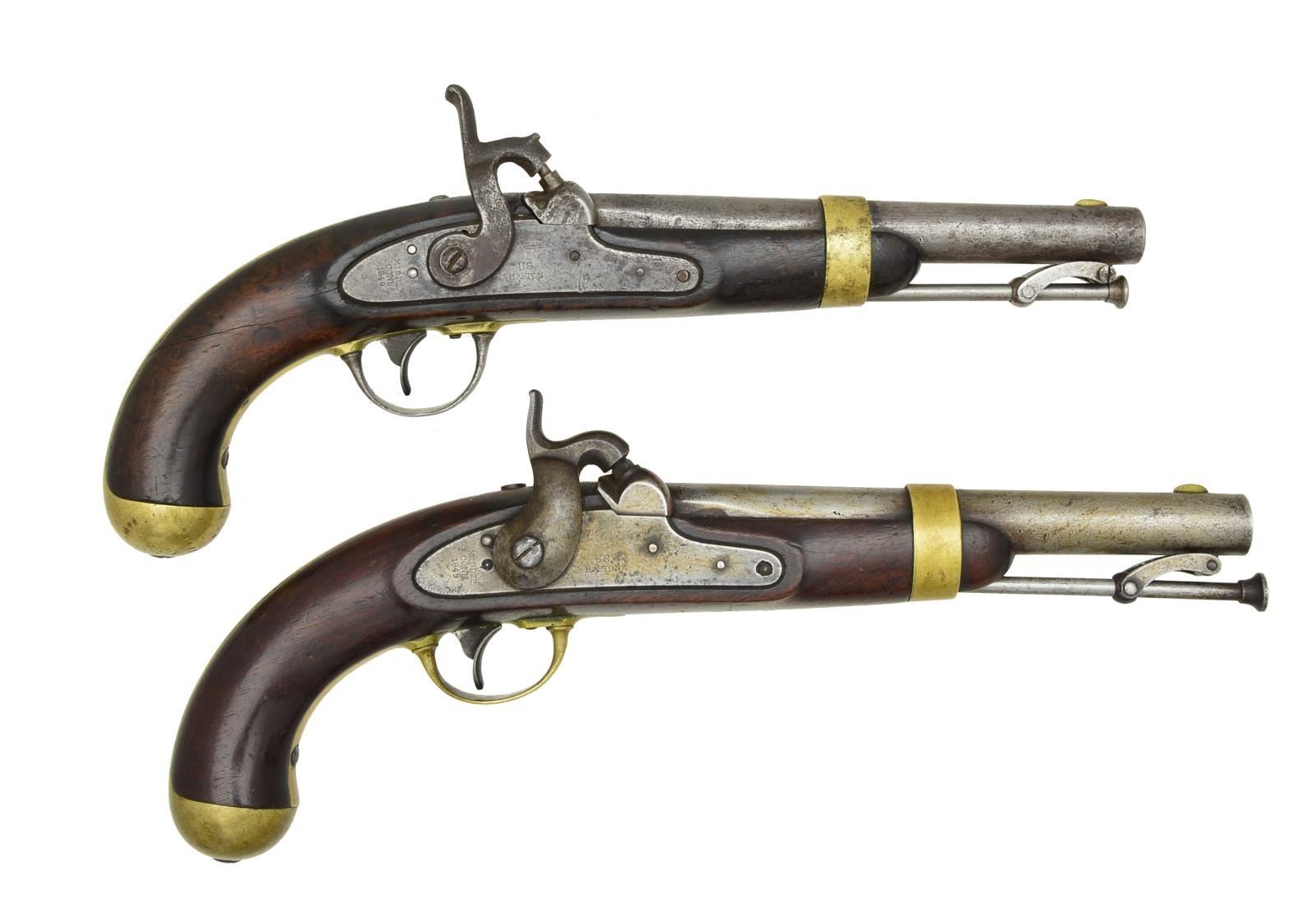 DRAGOON PISTOLS. BOTH: Cal. 54. NSN. Bbls. 8 1/2". These pistols were originally issued in pairs w/ pommel holsters for dragoons & officers. 1) Gun 1 is all original & very good overall w/ crisp markings on breech, lock & 2 crisp inspector cartouches in stock. Stock has sharp crisp edges. Original swivel ramrod is bent. CONDITION: fine mechanics & clear, dark bore. 2) Gun 2 of this pair has seen much use but has an inscription on the backstrap: “Lt. A. A. Lesueur”. CONDITION: this gun is fair to good overall. Hammer has been changed to sporting style. Lock screws & tang screw are replaced. Loading assembly is reproduction. Stock is worn w/ numerous sm. dings, dents, & scratches. Inspector cartouches are still discernible in outline. 3 Long hairline cracks in wrist. Mechanics need attention. Pitted smooth bore. PROVENANCE: The Estate Collection of Gary Parietti. (01-19319(2)/JS). BOTH ANTIQUE. $700-900.