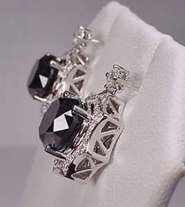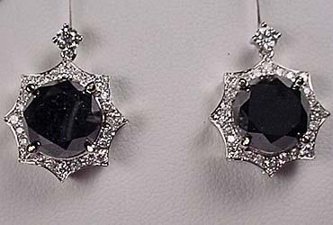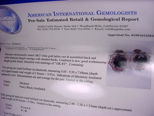 PAIR OF 18K WHITE GOLD BLACK AND WHITE DIAMOND EARRINGS - Comes with AIG Appraisal of $25,000.00. 2 Prong Set Round Brilliant Cut Black Diamonds, Center Stones, 50 Prong and Bead Set Round Brilliant Cut Diamonds. Diamonds - 10.89 CT., TW - 9.07 Grams