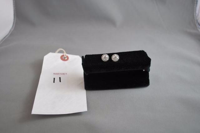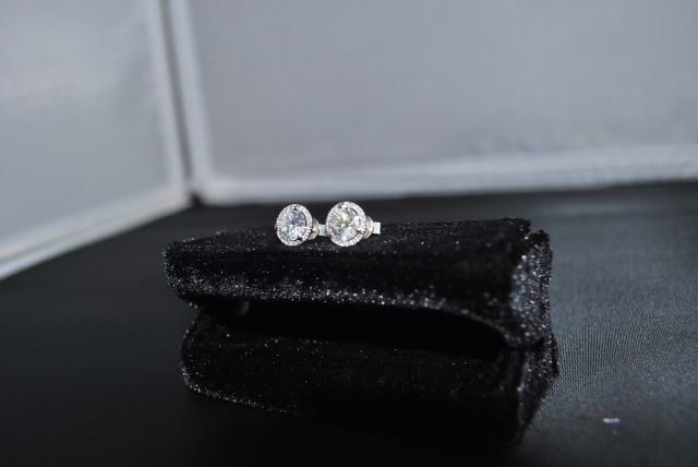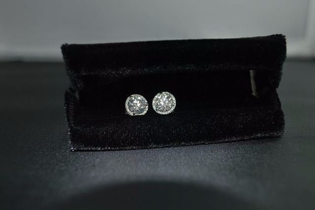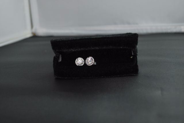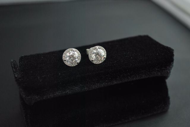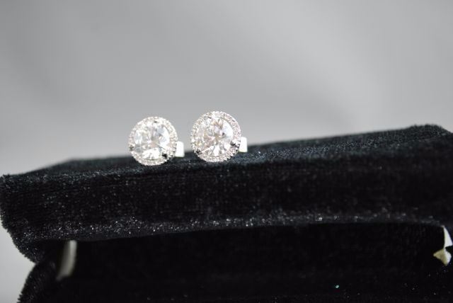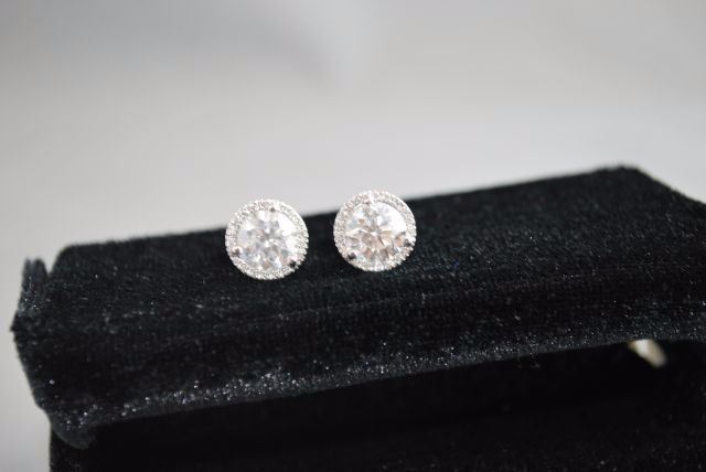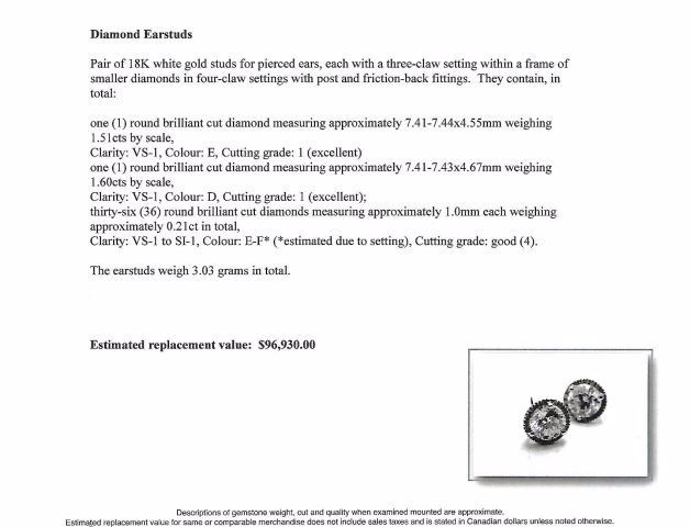 PAIR OF 18K WHITE GOLD STUDS FOR PIERCED EARS, EACH WITH A THREE-CLAW SETTING WITHIN A FRAME OF SMALLER DIAMONDS IN FOUR-CLAW SETTINGS WITH POST AND FRICTION-BACK FITTINGS. THEY CONTAIN, IN TOTAL: ONE (1) ROUND BRILLIANT CUT DIAMOND MEASURING APPROXIMATELY 7.41-7.44X4.55MM WEIGHING 1.51CTS BY SCALE, CLARITY: VS-1, COLOUR: E, CUTTING GRADE: 1 (EXCELLENT); ONE (1) ROUND BRILLANT CUT DIAMOND MEASURING APPROXIMATELY 7.41 - 7.43 X 4.67MM WEIGHING 1.60CTS BY SCALE, CLARITY: VS-1, COLOUR: D, CUTTING GRADE: 1 (EXCELLENT); THIRTY-SIX (36) ROUND BRILLIANT CUT DIAMONDS MEASURING APPROXIMATELY 1.0MM EACH WEIGHING APPROXIMATELY 0.21CT IN TOTAL, CLARITY: VS-1 TO SI-1, COLOUR: E-F* (*ESTIMATED DUE TO SETTING), CUTTING GRADE: 4 (GOOD). THE EARSTUDS WEIGH 3.03 GRAMS IN TOTAL. ESTIMATED REPLACEMENT VALUE - $96,930. ALL ESTIMATES AND VALUES ARE APPROXIMATE AND USED FOR GUIDELINES ONLY.