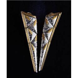 Lot 142 PAIR OF 18KT GOLD AND PLATINUM DESIGNER EARRINGS Marked “18K” and “Plat” with an unknown maker’s mark of a triangle with circle. An elongated triangle shape made of five triangles which articulate slightly. Yellow gold on two edges, engine type turns with white and gold design. For pierced ears with loop safety. WEIGHT: 36gr. SIZE: 2-3/4” l x 1/2” w. CONDITION: Very good. 5-70827