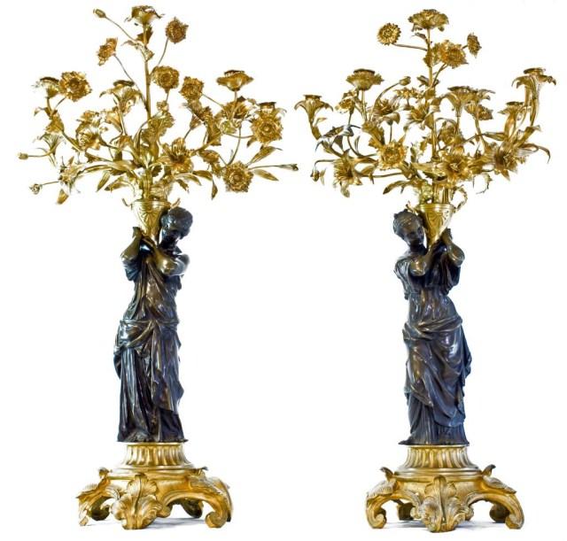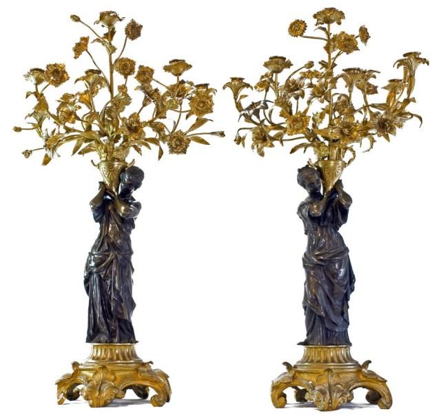 Magnificent pair of French 19th Century 6 arm candelabras. Having Exquisite Dore bronze floral pattern leading to the 6 candle bases. Adorned by a pair of dark bronze patina robed women (left and right) Dore bronze. Base has beautiful scroll design. Measures 31 1/4" height.