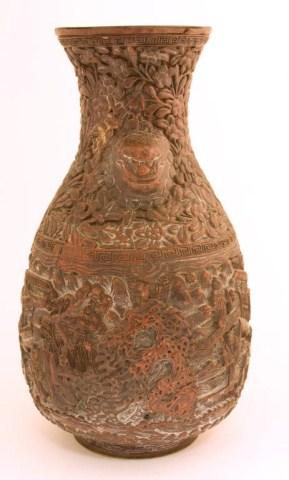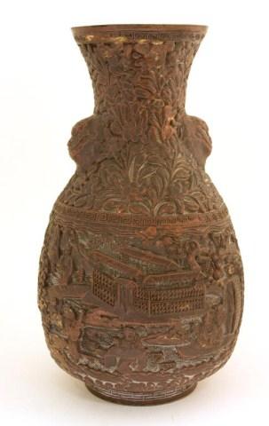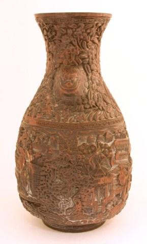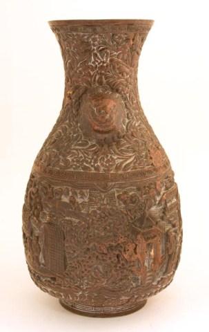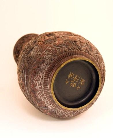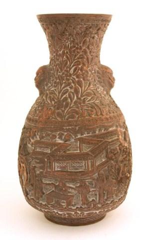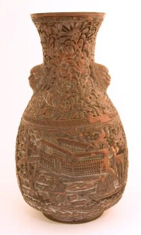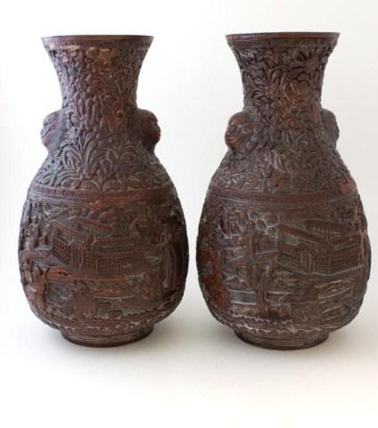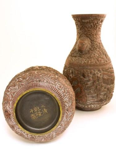 Neck has an intricate floral design. Bottom half depicts a palace scene. Has Etruscan design borders. Signed on bottom. Each measures 10" height.