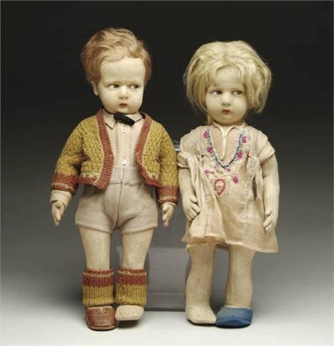 PAIR OF 300-SERIES LENCI DOLLS. 17" (43 cm) each. CONDITION: Each lacking one shoe and both w/significant surface dust. Girls costume in very bad and incomplete condition. 1-5586 RS