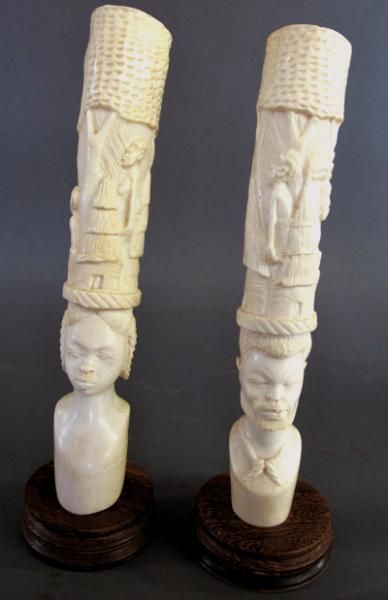 -of male and female figures with elaborate headdresses, each on wooden base.