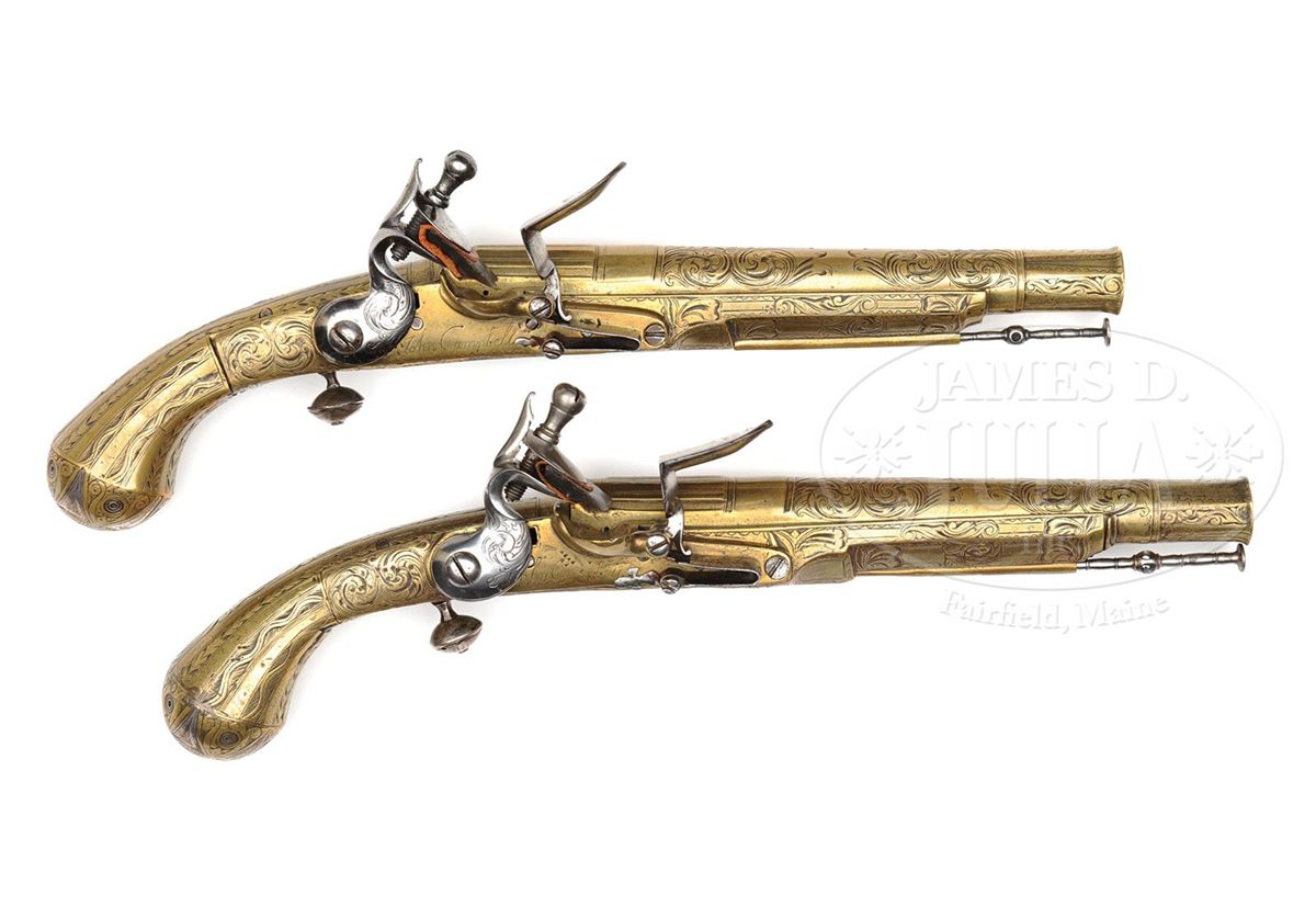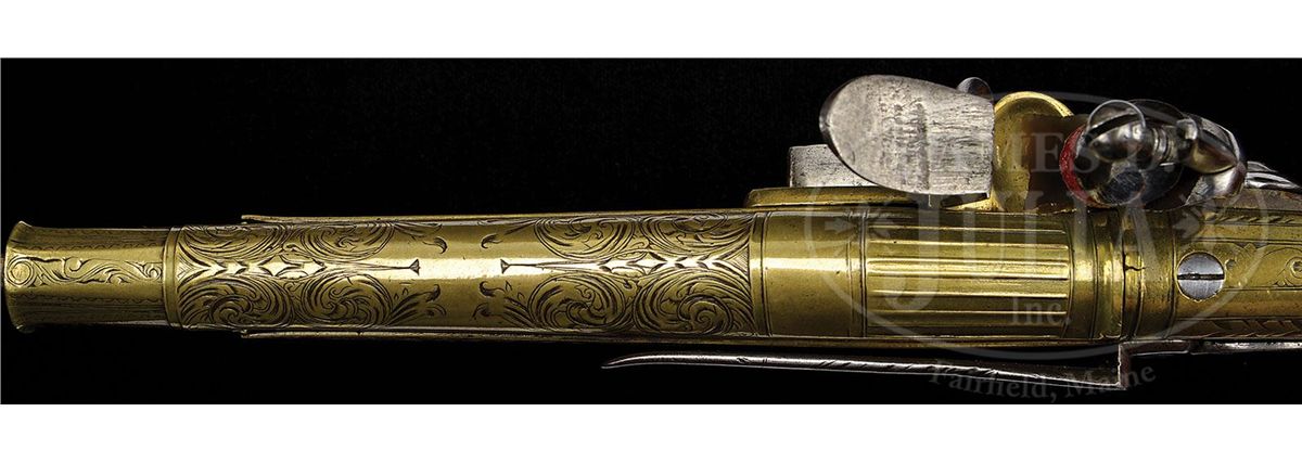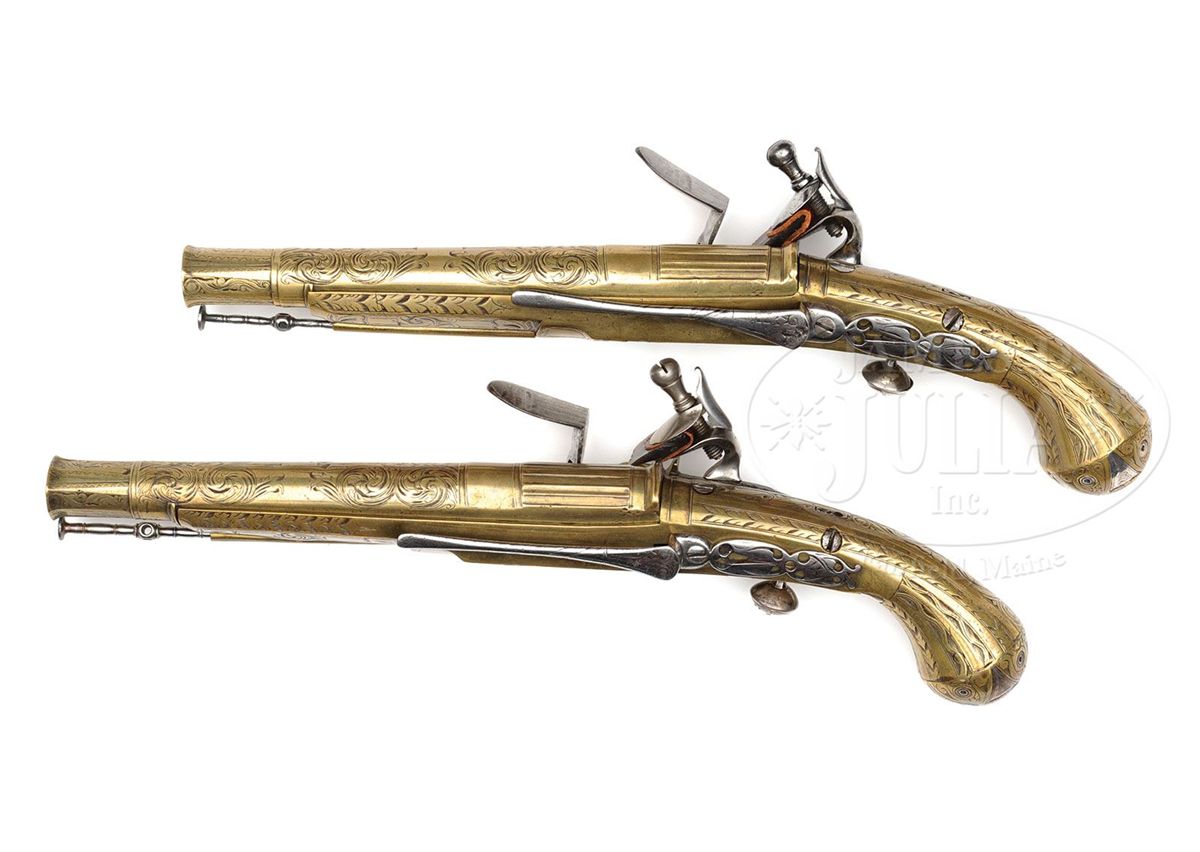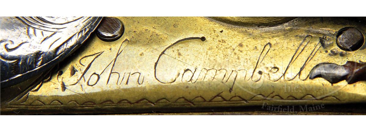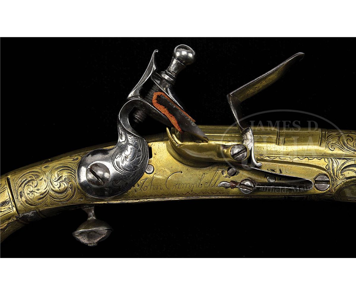 NSN. Cal. .548 Bore diameter. These interesting pistols from this well known gunsmithing town, are by John Campbell, grandson of the first John Campbell, gunmaker, and were made before 1798. They have 7-1/8" brass bbls with slight bell at muzzles. Bbls are engraved with well cut, large scroll, and with fluting at rear ends. Typical Scottish miquelet type vertical seared locks have brass lockplates and integral brass pans with steel bridled friction frizzens. Round bodied, serpentine cocks are nicely filed, and have scroll engraving matching that of tails of lockplates, which are also engraved "John Campbell" under pans. Traditionally engraved brass frames have silver band inlays along bottoms and around knobs of slightly flared ball grips. Flattened ball triggers are also of silver. Steel belt hooks with pierced and engraved decoration on tails, are affixed to left sides of pistols. Typical thin fancy turned ramrods mount through long, plain, single pipe. PROVENANCE: Collection of Dr. Douglas Sirkin. CONDITION: Fine. All brass is toning back to a medium mustard yellow, engraving slightly softened. Steel parts cleaned to silver and pewter. Silver inlays toning. Lockplate of one pistol does not fit well at rear. This pistol also has halves of ball trigger separated. Rear band of bottom silver inlay of the other pistol has some loss, and it appears that the cock is an exceptionally well done replacement. An unusual pair of Scottish pistols, most likely owned by a Naval officer. 4-49862 MGM324