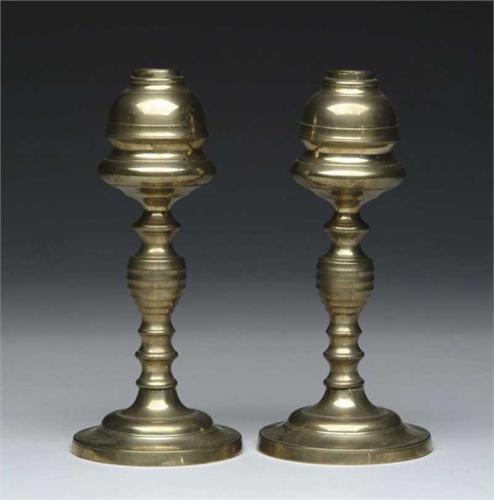 PAIR OF AMERICAN BRASS TURNED WHALE OIL LAMPS. Attributed to Webb of Portland. The round base urn turned shaft with shaped font. Unsigned. Missing burners. SIZE: 8-1/4” h. CONDITION: Very good. 9-26664