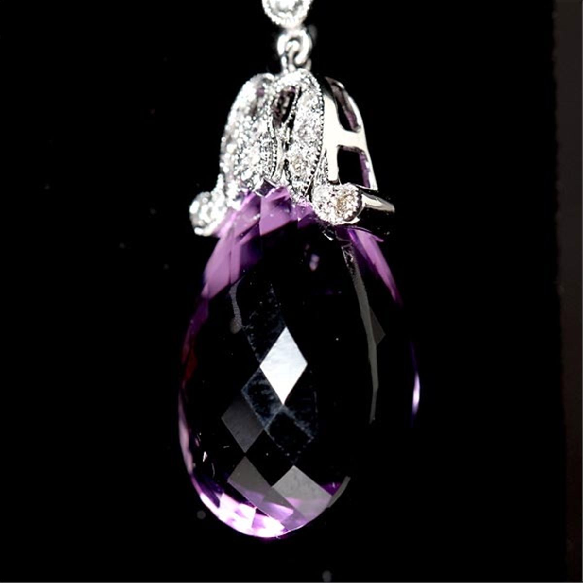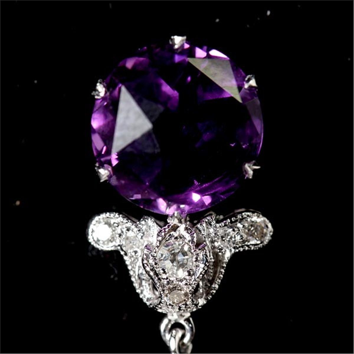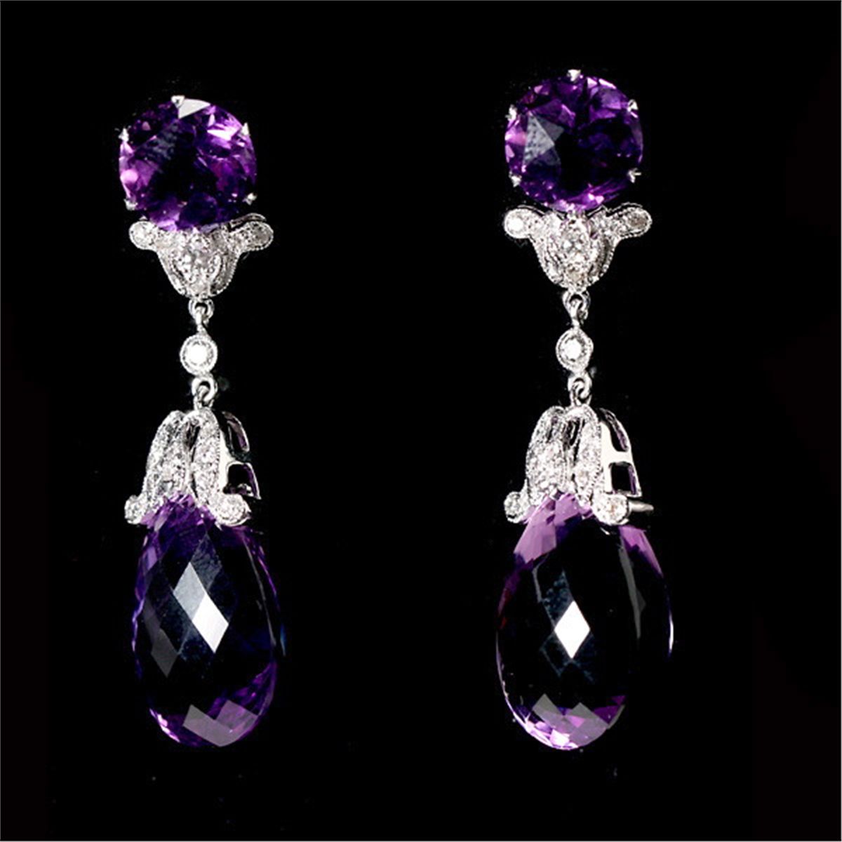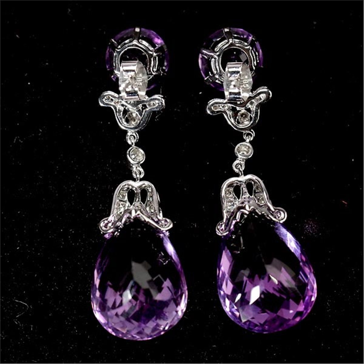 PAIR OF AMETHYST, DIAMOND, 14K WHITE GOLD EARRINGS. Each featuring one faceted pear-cut and round-cut amethyst, weighing a total of approximately 16.00 cts., accented by nineteen round-cut diamonds, weighing a total of approximately 0.20 ct., prong and bead set in a drop style articulated mounting completed by a post and friction back. 7.80 dwts