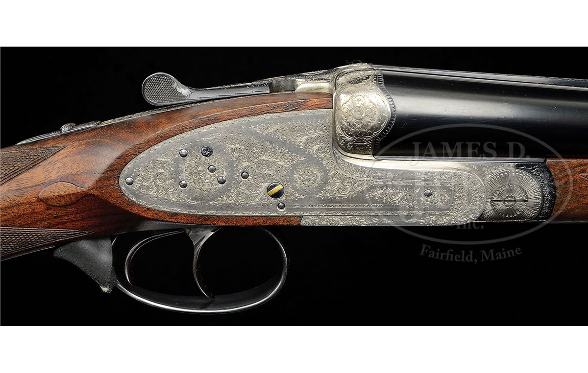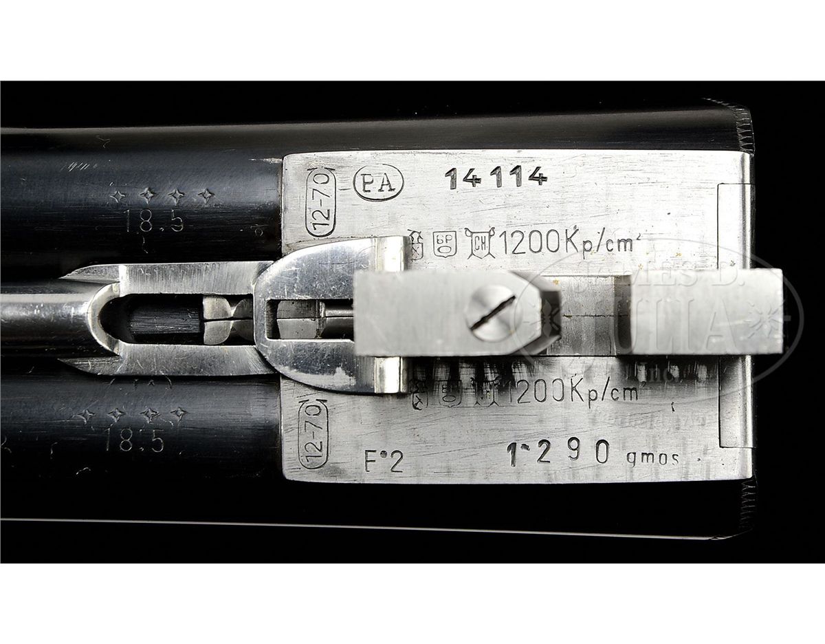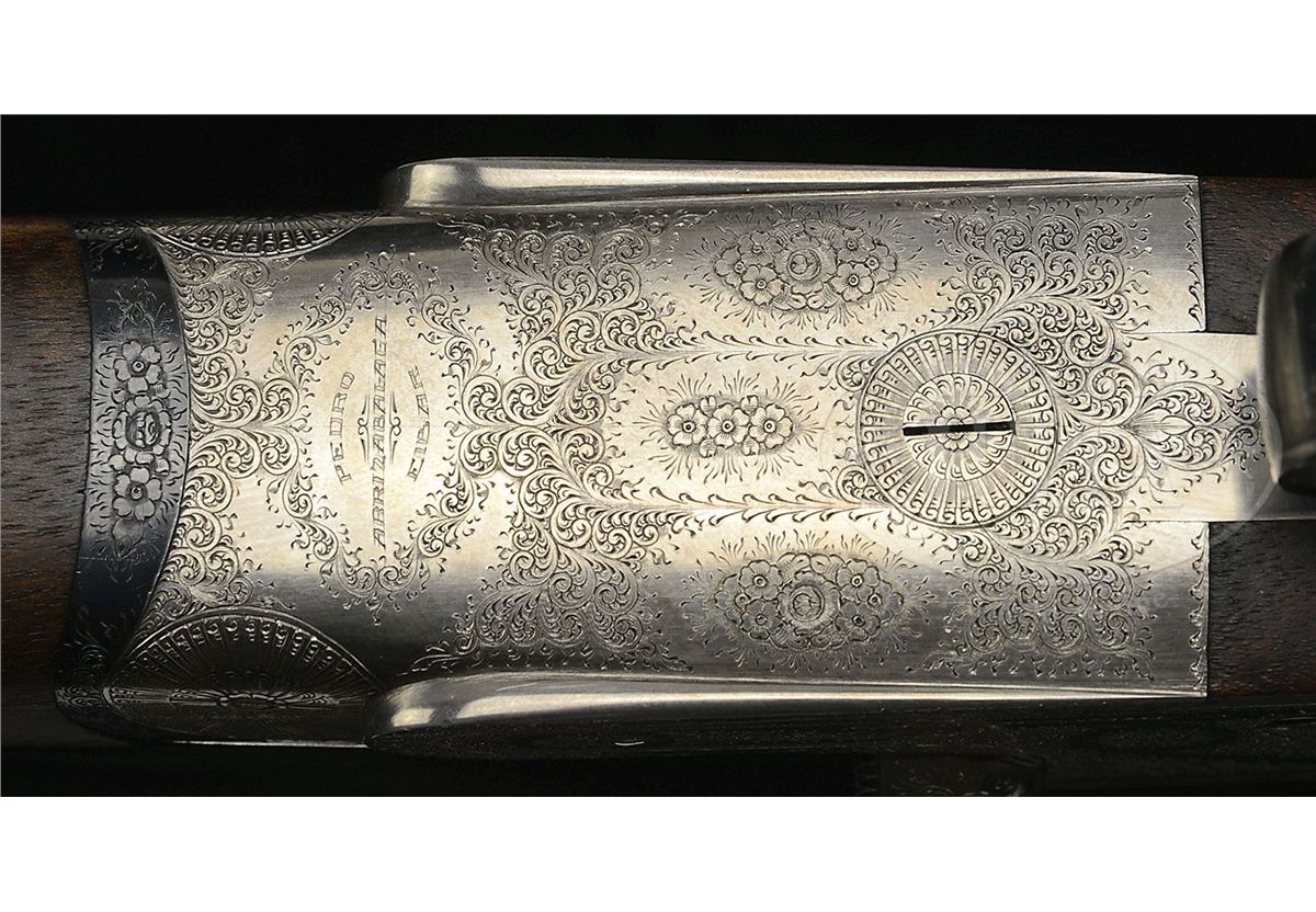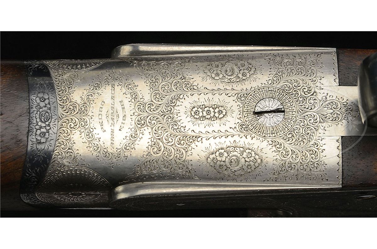SN 14114/ 14115. Cal. 12 ga. 3" Chambers. 28" Chopper lump bbls with damascened narrow game ribs, are engraved "Pedro Arrizabalaga, Eibar" on top right. Bbl flats are stamped with Spanish nitro proofs for 2-3/4" chambers. Each set of bbls is fitted with H & H style self-opening assist springs. Coin finished actions feature automatic safeties (SAFE inlaid in gold), bushed strikers, hidden third fasteners, side clips, gold band tumbler end cocking indicators, double triggers (front articulated), and H & H style detachable locks. Actions are engraved with well cut English style scroll with rose medallion highlights. "P. Arrizabalaga" is on each lockplate. The name appears again on the bottom of each action, along with "Eibar". The numbers "1" and "2" are inlaid in gold on the rear of each rib, top lever, and forend tip, respectively. Nicely figured, well matched, light colored European walnut straight grip buttstocks measure 15" over solid brown recoil pads, and feature drop points, point pattern checkering with double line borders, and the letters "GMB" (consignor states, George M. Barley, Jr, founder of Save Our Everglades Foundation) individually inlet in gold on toe lines. Matching splinter ejector forends have Anson releases. Gun no. "1" (14114): Bore diameter: left-.727, right -.728. Bore restrictions: left -.008 (IC), right -.009 (IC). Wall thickness: left -.029, right -.026. Drop at heel: 1-7/8", drop at comb: 1-3/8". Weight: 6 lbs. 14 oz. LOP: 15". Gun no. "2" (14115): Bore diameter: left-.728, right -.729. Bore restrictions: left -.009 (IC), right -.010 (IC). Wall thickness: left -.027, right -.0024. Drop at heel: 1-15/16", drop at comb: 1-3/8". Weight: 6 lbs. 14 oz. LOP: 15". Included is a black ABS two gun case lined in maroon velvet, with combination lock latches. PROVENANCE: Notes on G. M. Barley, Jr. founder of the Save Our Everglades Foundation. CONDITION: Excellent. Bbls retain nearly all their lustrous orig blue with numerous minor nicks and light scratches. Actions retain nearly all of their bright coin finish. Rubber bumpers are attached to rear of trigger guard bows. Stocks retain nearly all of their rubbed oil finish with numerous rubs and marks from normal handling and use. Both guns have some deeper scratches on right side of toe lines. Bores are excellent. Actions are tight. Bbls are on face. Ejectors are very slightly out of time on gun no. "2". Case is good with numerous scuffs on exterior. Interior velvet is lifting with foam escaping. A nice handling, well made pair of guns, with a manufacturers suggested retail of over $20,000.00 each. 4-48633 MGM16