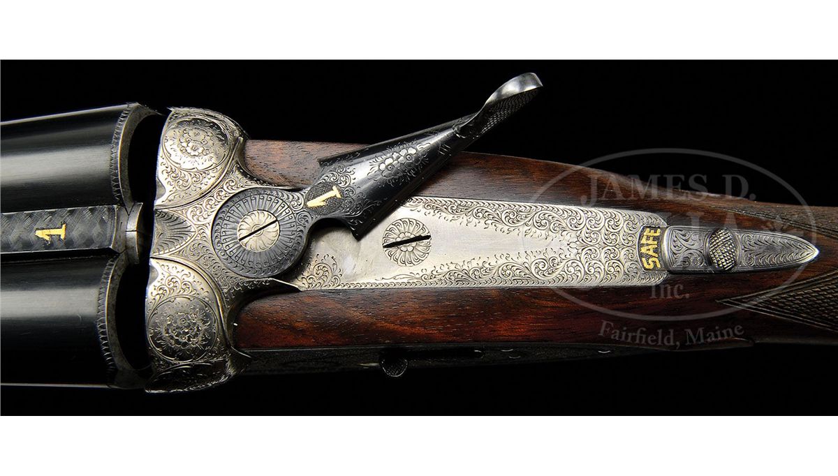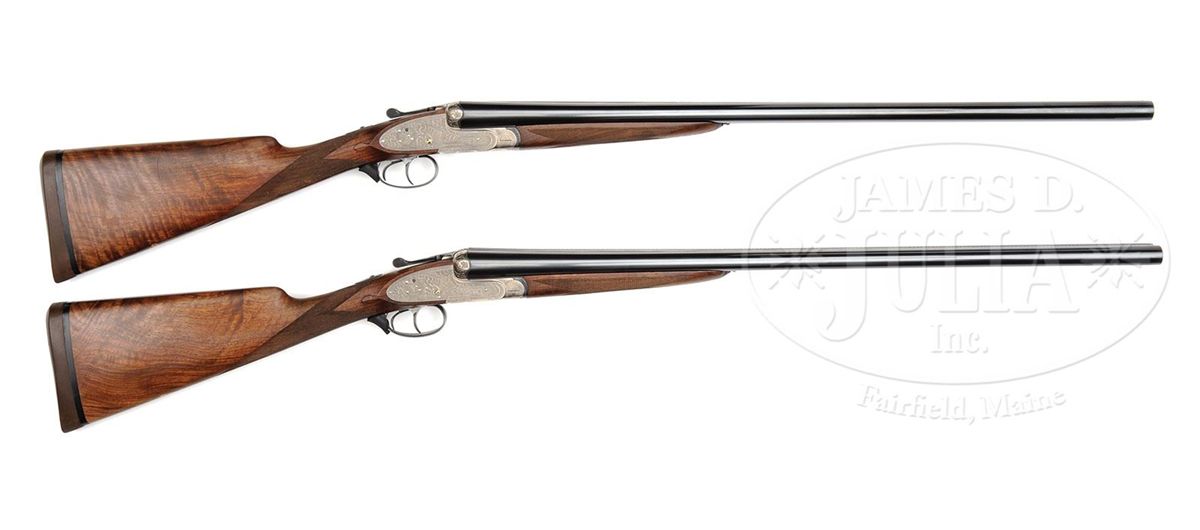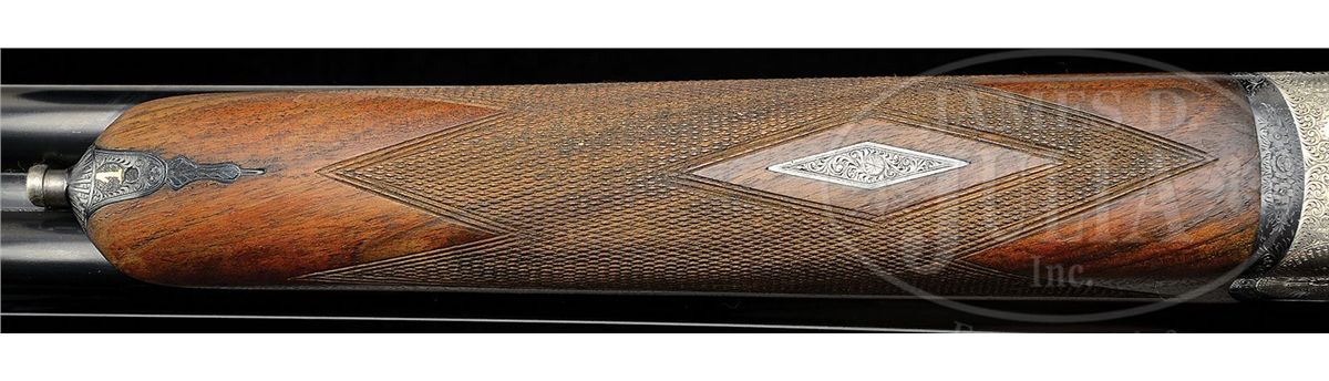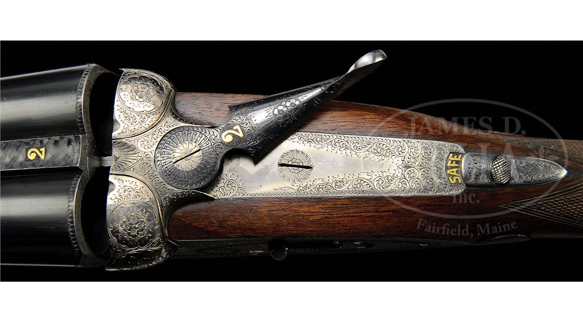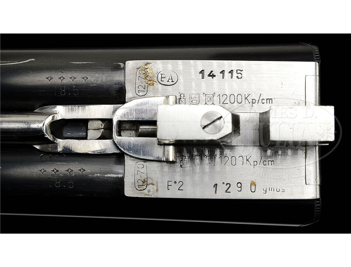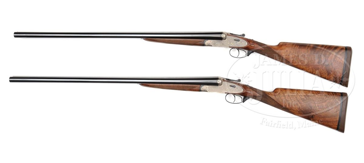 SN 14114/ 14115. Cal. 12 ga. 3" Chambers. 28" Chopper lump bbls with damascened narrow game ribs, are engraved "Pedro Arrizabalaga, Eibar" on top right. Bbl flats are stamped with Spanish nitro proofs for 2-3/4" chambers. Each set of bbls is fitted with H & H style self-opening assist springs. Coin finished actions feature automatic safeties (SAFE inlaid in gold), bushed strikers, hidden third fasteners, side clips, gold band tumbler end cocking indicators, double triggers (front articulated), and H & H style detachable locks. Actions are engraved with well cut English style scroll with rose medallion highlights. "P. Arrizabalaga" is on each lockplate. The name appears again on the bottom of each action, along with "Eibar". The numbers "1" and "2" are inlaid in gold on the rear of each rib, top lever, and forend tip, respectively. Nicely figured, well matched, light colored European walnut straight grip buttstocks measure 15" over solid brown recoil pads, and feature drop points, point pattern checkering with double line borders, and the letters "GMB" (consignor states, George M. Barley, Jr, founder of Save Our Everglades Foundation) individually inlet in gold on toe lines. Matching splinter ejector forends have Anson releases. Gun no. "1" (14114): Bore diameter: left-.727, right -.728. Bore restrictions: left -.008 (IC), right -.009 (IC). Wall thickness: left -.029, right -.026. Drop at heel: 1-7/8", drop at comb: 1-3/8". Weight: 6 lbs. 14 oz. LOP: 15". Gun no. "2" (14115): Bore diameter: left-.728, right -.729. Bore restrictions: left -.009 (IC), right -.010 (IC). Wall thickness: left -.027, right -.0024. Drop at heel: 1-15/16", drop at comb: 1-3/8". Weight: 6 lbs. 14 oz. LOP: 15". Included is a black ABS two gun case lined in maroon velvet, with combination lock latches. PROVENANCE: Notes on G. M. Barley, Jr. founder of the Save Our Everglades Foundation. CONDITION: Excellent. Bbls retain nearly all their lustrous orig blue with numerous minor nicks and light scratches. Actions retain nearly all of their bright coin finish. Rubber bumpers are attached to rear of trigger guard bows. Stocks retain nearly all of their rubbed oil finish with numerous rubs and marks from normal handling and use. Both guns have some deeper scratches on right side of toe lines. Bores are excellent. Actions are tight. Bbls are on face. Ejectors are very slightly out of time on gun no. "2". Case is good with numerous scuffs on exterior. Interior velvet is lifting with foam escaping. A nice handling, well made pair of guns, with a manufacturers suggested retail of over $20,000.00 each. 4-48633 MGM16