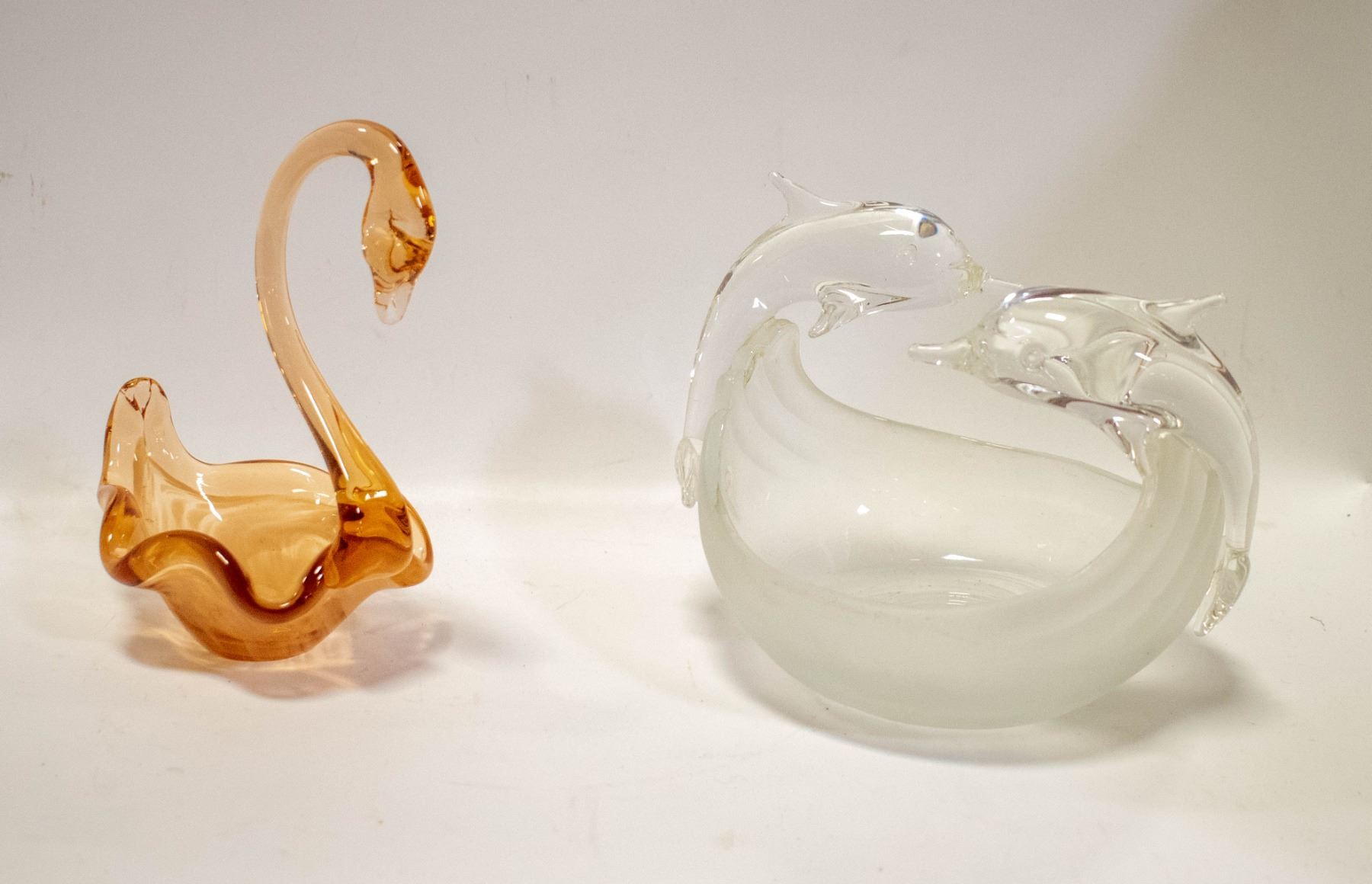 DISHES CHALET STYLE GLASS SWAN DISH + DOUBLE DOLPHINS DIVING BOWL **ALL ITEMS MUST BE REMOVED BY 5PM SATURDAY, DECEMBER 6TH 2025. ALL REMAINING ITEMS WILL BE SUBJECT TO A $6.00 PER DAY STORAGE CHARGE. ANY ITEMS REMAINING AFTER MONDAY, DECEMBER 22ND 2025 WILL BE CONSIDERED FORFEITED. NO REFUNDS WILL BE ISSUED FOR FORFEITED ITEMS. TO SCHEDULE A PICK UP APPOINTMENT CLICK HERE