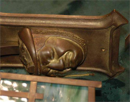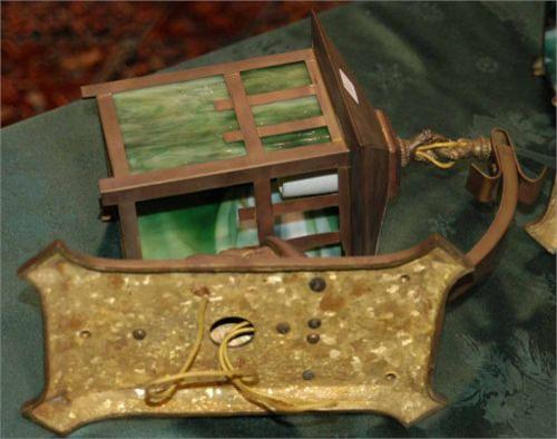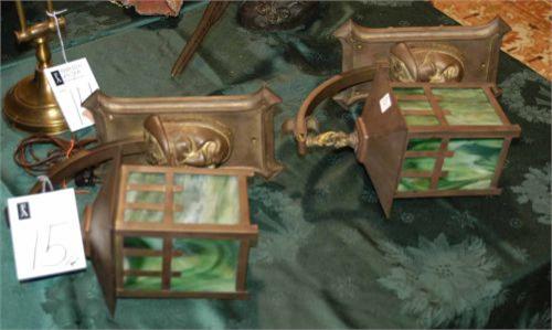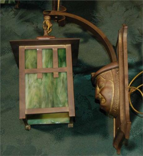 "PAIR OF ARTS & CRAFTS WALL SCONCES, the wall mount with monk's head and the hanging lanterns with stained glass circa 1910, excellent packing and shipping (excluding insurance) $30"