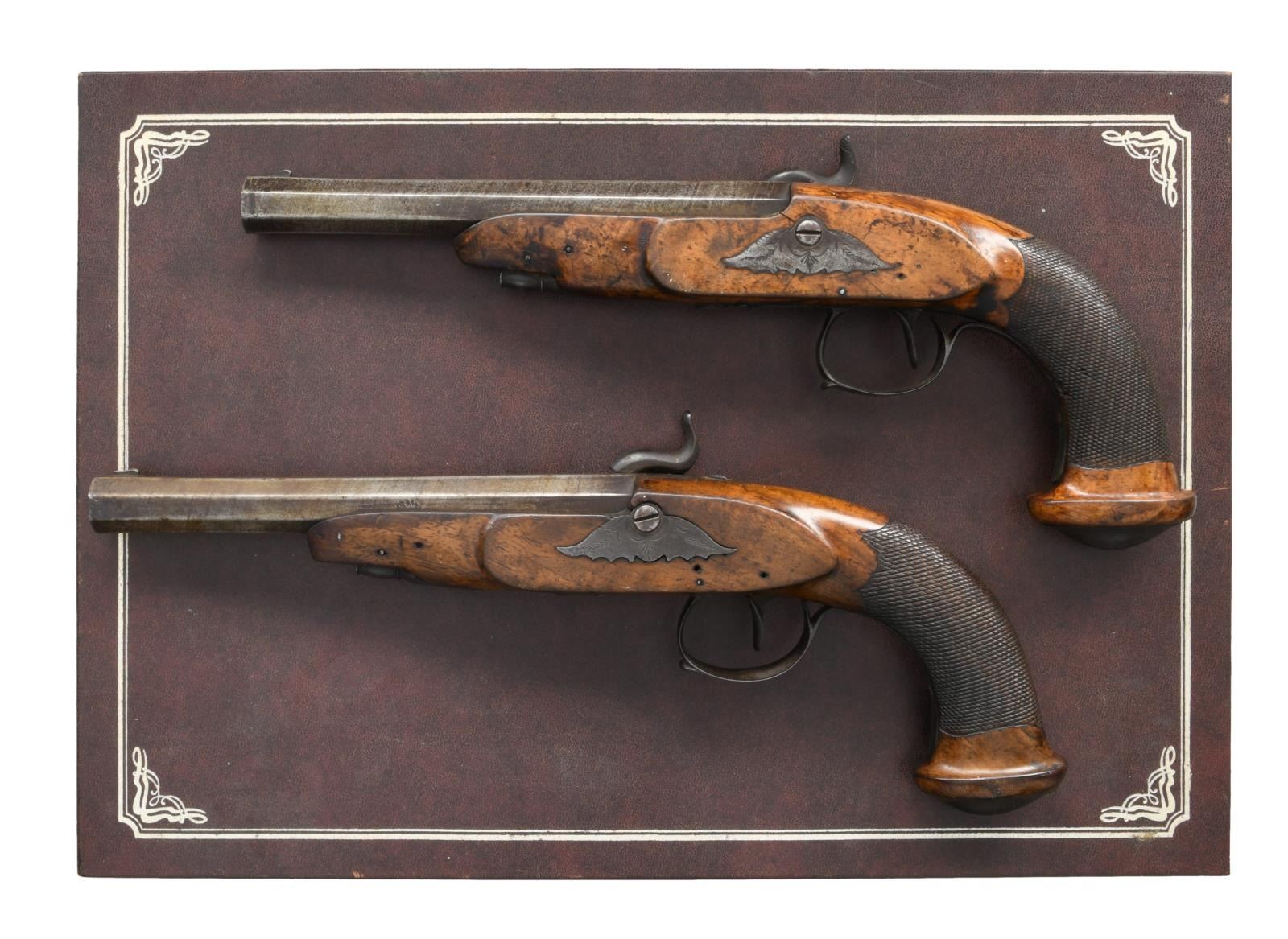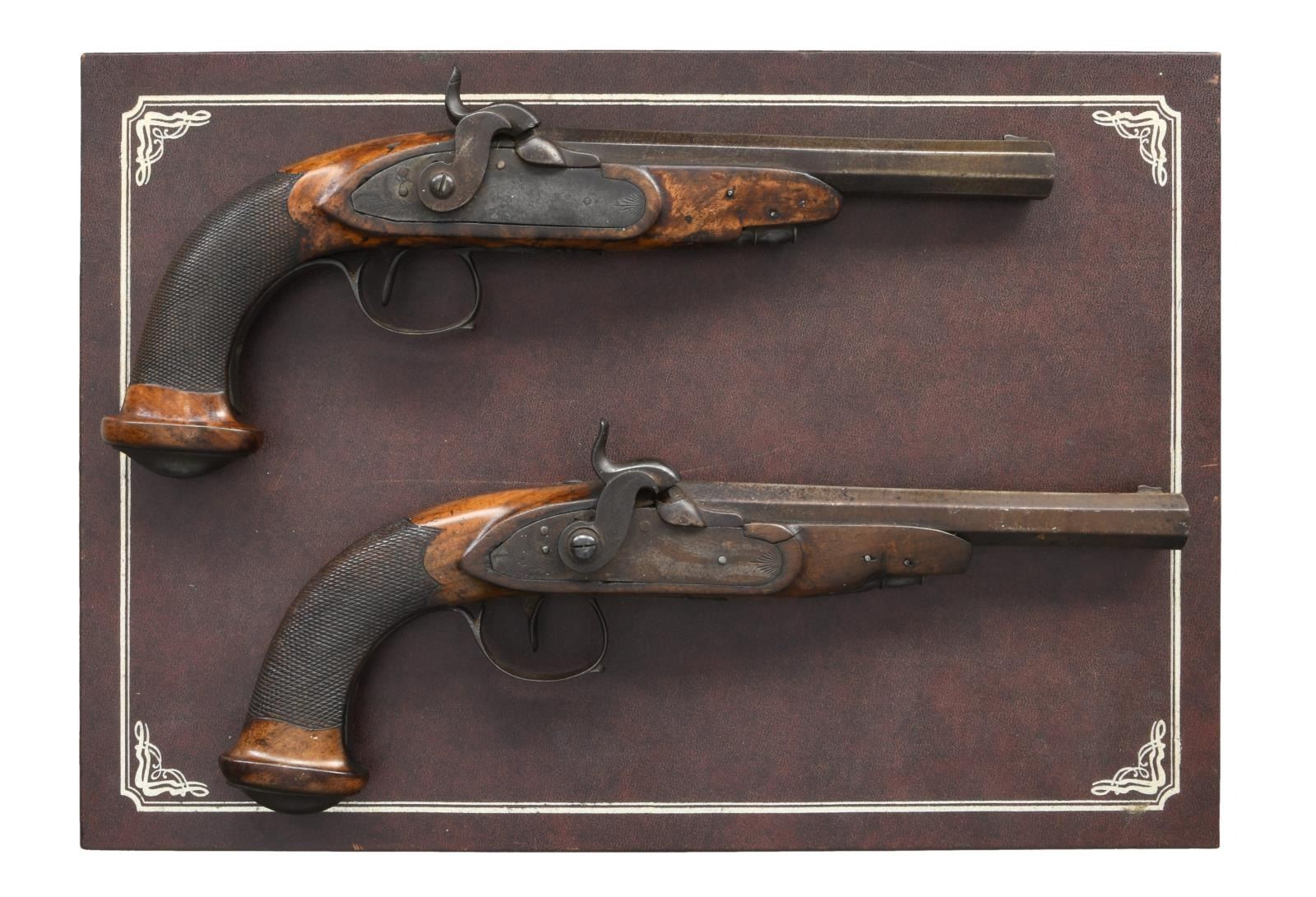 Cal. .60. S# NSN. Bbl 8". Pair of Belgian percussion dueling pistols produced by an unknown maker. Lockplates are unmarked aside from some light foliate pattern engraving, which is also present on the tangs, trigger guards, and oval pommel caps. Belgian definitive proof is stamped on top of the faceted barrels at breech. Wood stocks with checkering at wrists. Ramrods are not present. UNATTACHED ACCESSORIES: contemporary leatherette case. CONDITION: metal components retain a dark mottled gray/brown patina, with some scattered oxidation. Trigger guard on one pistol is no longer attached at the front. Stocks show scattered marks from ahndling and storage, with one pistol exhibiting a crack at the lockplate and another at the sideplate. (01-23306/MLW). ANTIQUE. $300-400.