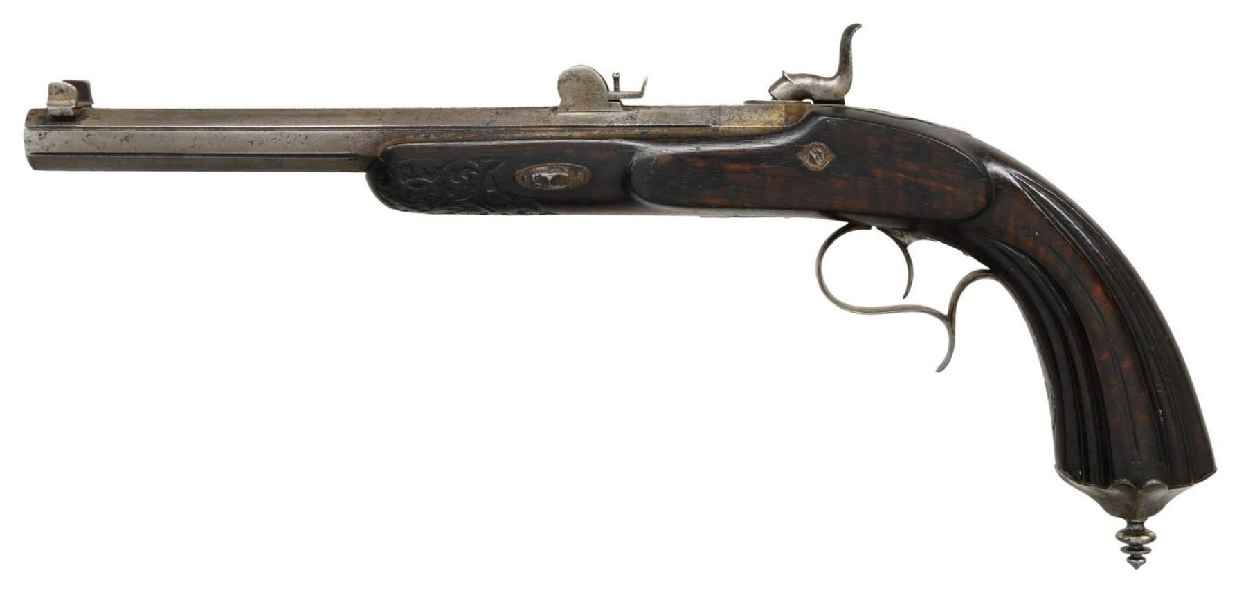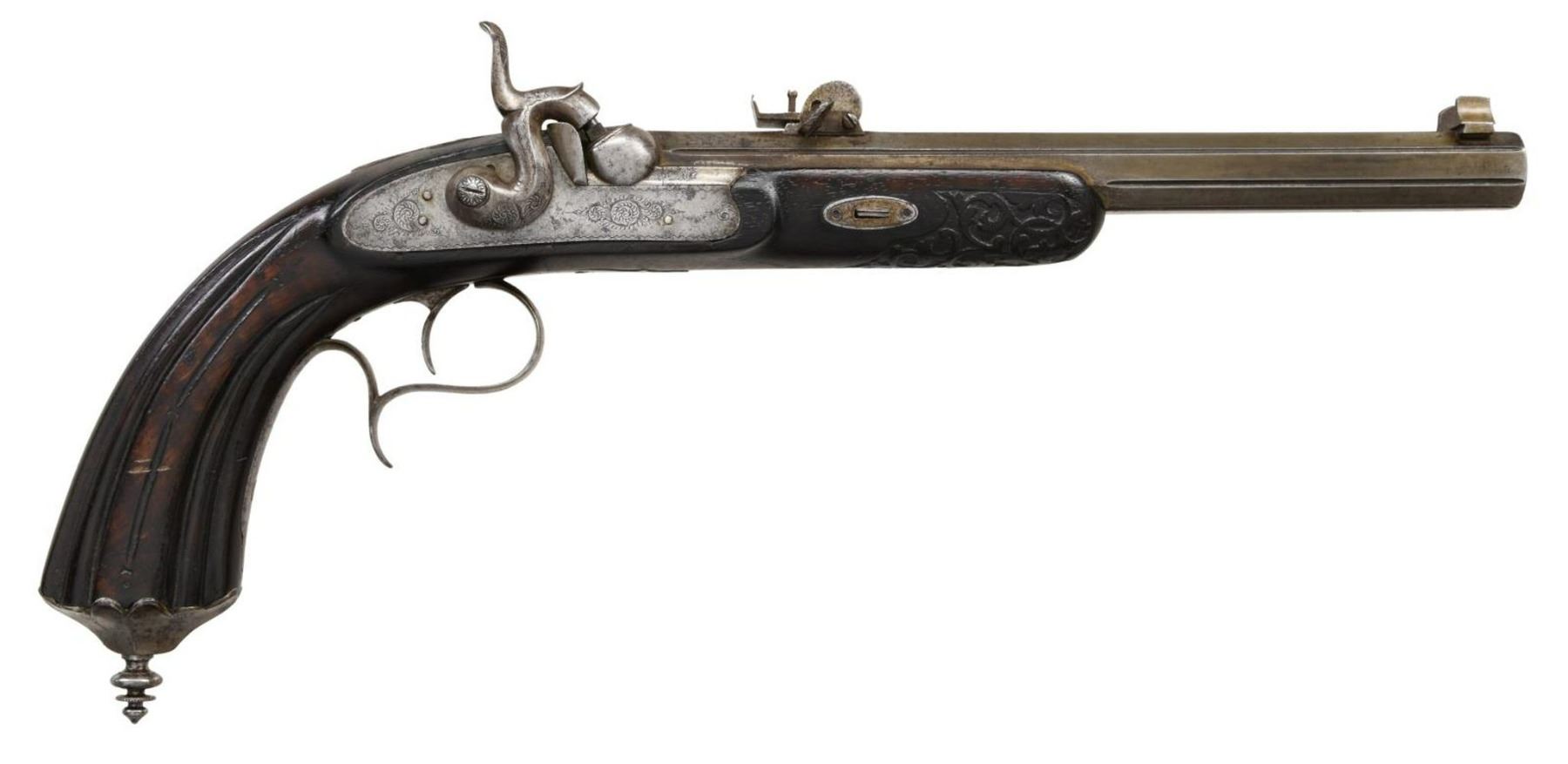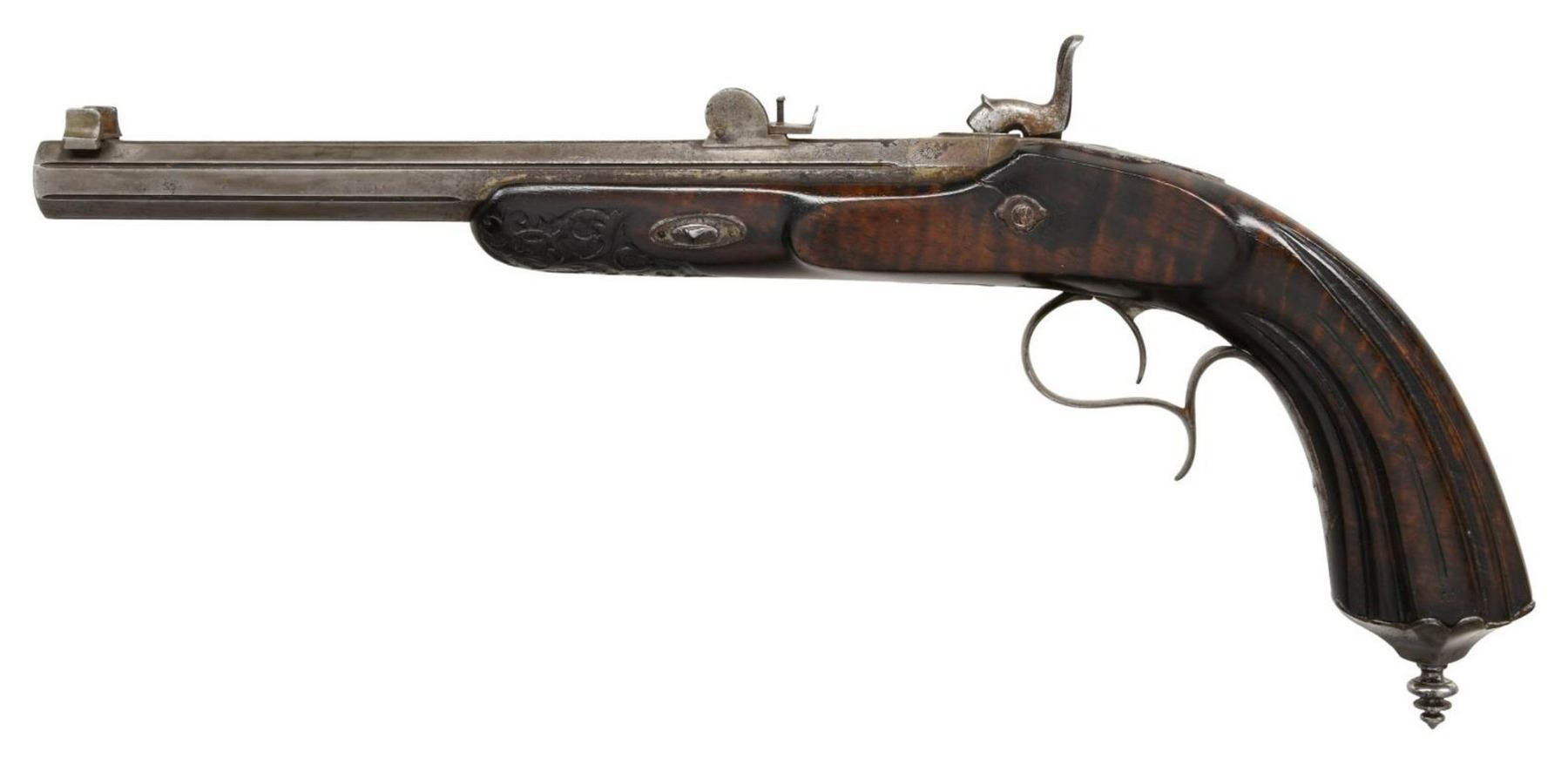Cal. 45. NSN. Bbls. 10" oct. Pistols appear similar to French made Gastinne Renette examples but makers markings visible. Post front sights w/ guard. Elevator adjustable rear sights. Right bbl. flat on each pistol has Belgian Perron proof. Various parts of pistols have floral engraving. Pistols are numbered "1' & '2" on upper tangs. Finger curl trigger guards. Pointed grip caps. Hardwood stock w/ grooves on grip & floral carving at front. CONDITION: pistol 2 has a 1/3" crack ahead of recoil bolt, stocks otherwise show scattered dings & handling wear from the years. Metal is a gray patina w/ scattered oxidation. Bores show scattered oxidation but strong rifling. PROVENANCE: From the Harold Prucha Collection. (01-23216/MJC). ANTIQUE. $600-1000.