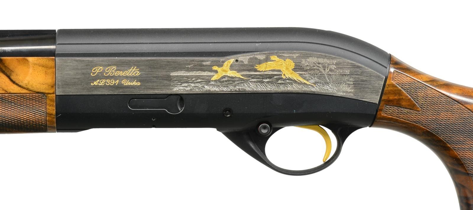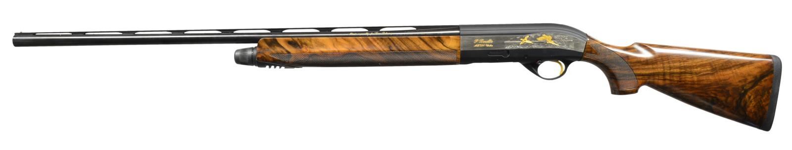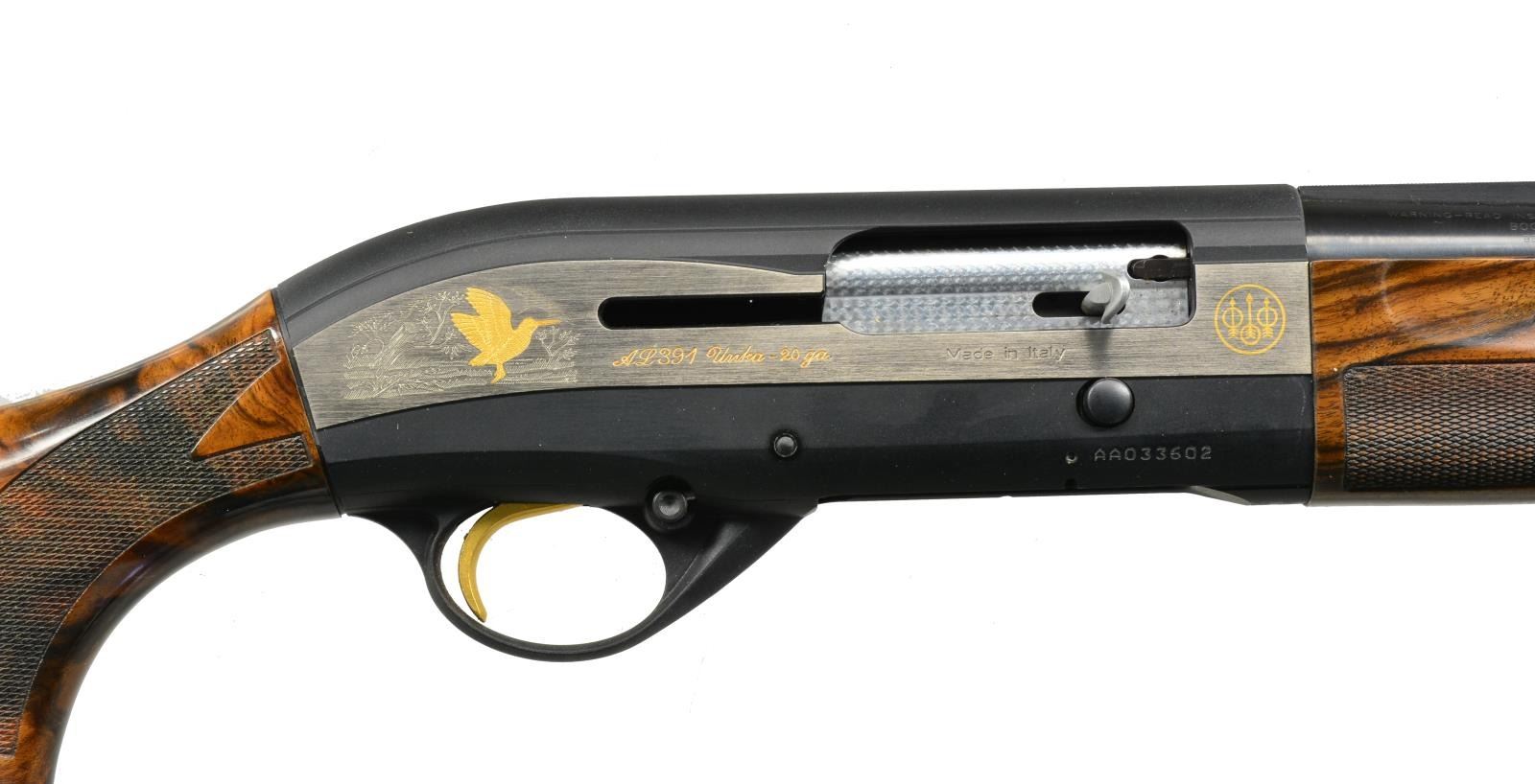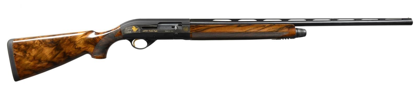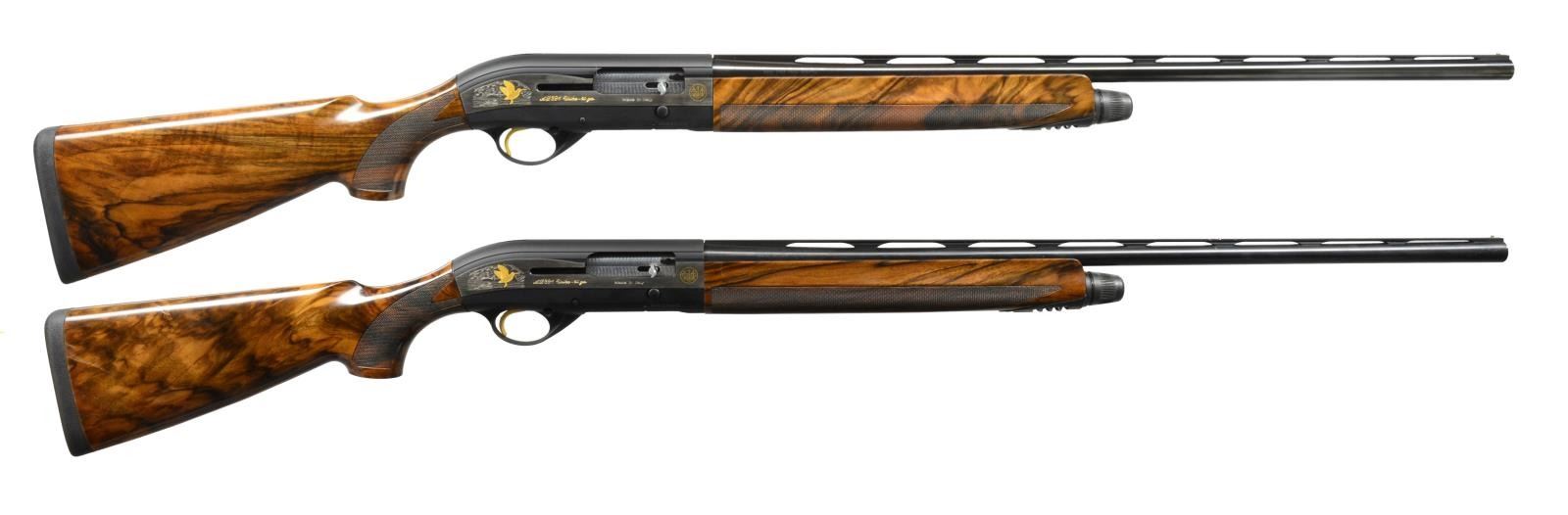 SHOTGUNS. 1) Cal. 20 Ga., 2 3/4" & 3". S# AA033601. Bbl. 28" VR w/ steel bead & fitted for Mobile chokes; full set of 5 tubes included. Left side of bbl. has gold inscription "Made Especially for Ken Behring". Matte black anodized alloy receiver w/ natural finished side panels having gold markings w/ game scenes having gold plated woodcock on right side & 2 flying pheasants on left side. Jeweled bolt & carrier. Gold finished trigger. Forearm & pistol grip buttstock of checkered fancy walnut having vivid marbling & dark streaking. LOP: 14 3/8" over solid black Beretta pad. UNATTACHED ACCESSORIES: blue molded case containing spare chokes, choke wrench, Beretta oil, stock shims, sling swivels, buttplate, grip cap, plug, owner's manual & warranty information. CONDITION: bbl. & action retain over 95% finish, left side of receiver shows area of light scratches. Stock & forearm have very good finish. Clean bright bore. (20-1172/DS). 2) Cal. 20 Ga., 3". S# AA033602. Bbl. 28" VR w/ steel bead & fitted for Mobile chokes; Imp. Mod., Mod., Imp. Cyl. & Cyl. tubes included. Left side of bbl. has inscription "Made Especially for Ken Behring". Matte black anodized alloy receiver w/ natural finished side panels having gold markings w/ game scenes having gold plated woodcock on right side & 2 flying pheasants on left side. Jeweled bolt & carrier. Gold finished trigger. Forearm & pistol grip buttstock of checkered fancy walnut having vivid marbling & dark streaking. LOP: 14 3/8" over solid black Beretta pad. Blue molded case containing spare chokes, choke wrench, Beretta oil, stock shims, sling swivels, buttplate, grip cap, plug, owner's manual & warranty information. CONDITION: action retains over 95% anodized finish showing area of light scratches across left side. Bbl. retains 95% blue w/ an area of spotted corrosion near muzzle. Wood has good finish, Stock has 2 areas of heavy dents on right side. (20-1173/DS). BOTH MODERN. $1,500-2,100.