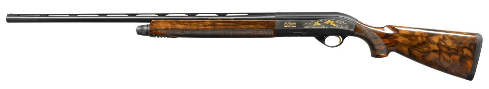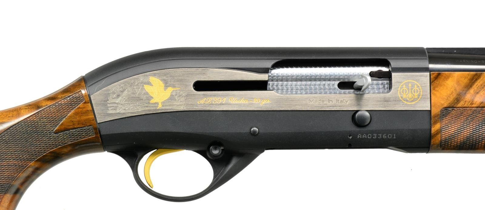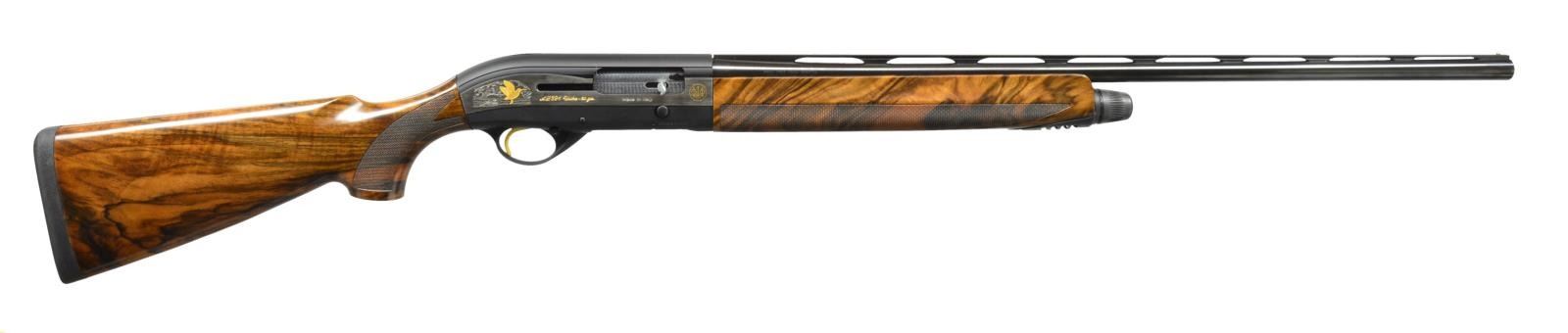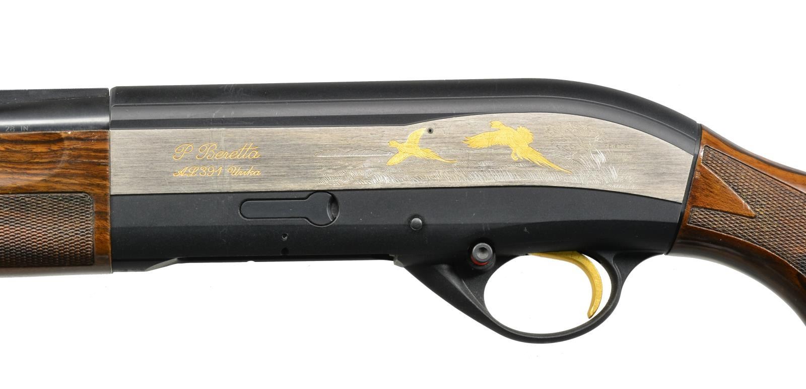 SHOTGUNS. 1) Cal. 20 Ga., 2 3/4" & 3". S# AA033601. Bbl. 28" VR w/ steel bead & fitted for Mobile chokes; full set of 5 tubes included. Left side of bbl. has gold inscription "Made Especially for Ken Behring". Matte black anodized alloy receiver w/ natural finished side panels having gold markings w/ game scenes having gold plated woodcock on right side & 2 flying pheasants on left side. Jeweled bolt & carrier. Gold finished trigger. Forearm & pistol grip buttstock of checkered fancy walnut having vivid marbling & dark streaking. LOP: 14 3/8" over solid black Beretta pad. UNATTACHED ACCESSORIES: blue molded case containing spare chokes, choke wrench, Beretta oil, stock shims, sling swivels, buttplate, grip cap, plug, owner's manual & warranty information. CONDITION: bbl. & action retain over 95% finish, left side of receiver shows area of light scratches. Stock & forearm have very good finish. Clean bright bore. (20-1172/DS). 2) Cal. 20 Ga., 3". S# AA033602. Bbl. 28" VR w/ steel bead & fitted for Mobile chokes; Imp. Mod., Mod., Imp. Cyl. & Cyl. tubes included. Left side of bbl. has inscription "Made Especially for Ken Behring". Matte black anodized alloy receiver w/ natural finished side panels having gold markings w/ game scenes having gold plated woodcock on right side & 2 flying pheasants on left side. Jeweled bolt & carrier. Gold finished trigger. Forearm & pistol grip buttstock of checkered fancy walnut having vivid marbling & dark streaking. LOP: 14 3/8" over solid black Beretta pad. Blue molded case containing spare chokes, choke wrench, Beretta oil, stock shims, sling swivels, buttplate, grip cap, plug, owner's manual & warranty information. CONDITION: action retains over 95% anodized finish showing area of light scratches across left side. Bbl. retains 95% blue w/ an area of spotted corrosion near muzzle. Wood has good finish, Stock has 2 areas of heavy dents on right side. (20-1173/DS). BOTH MODERN. $1,500-2,100.