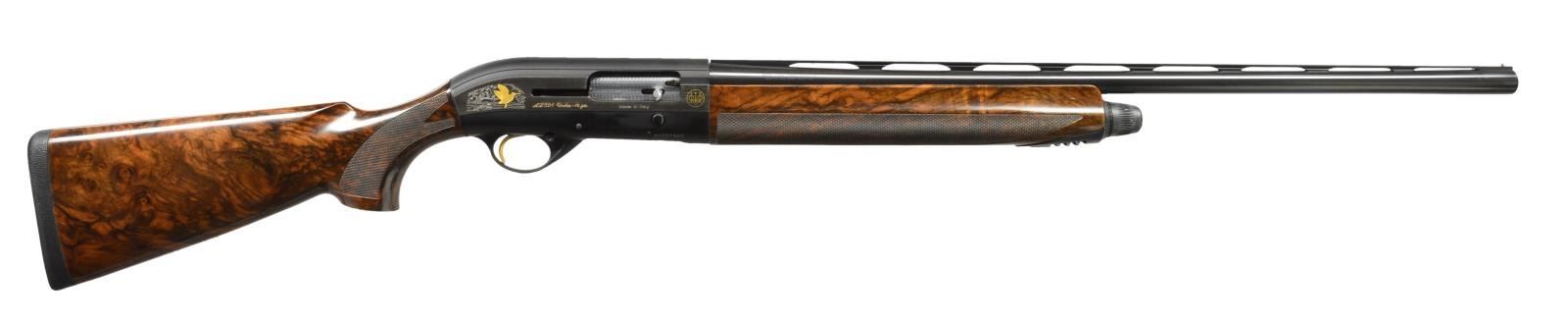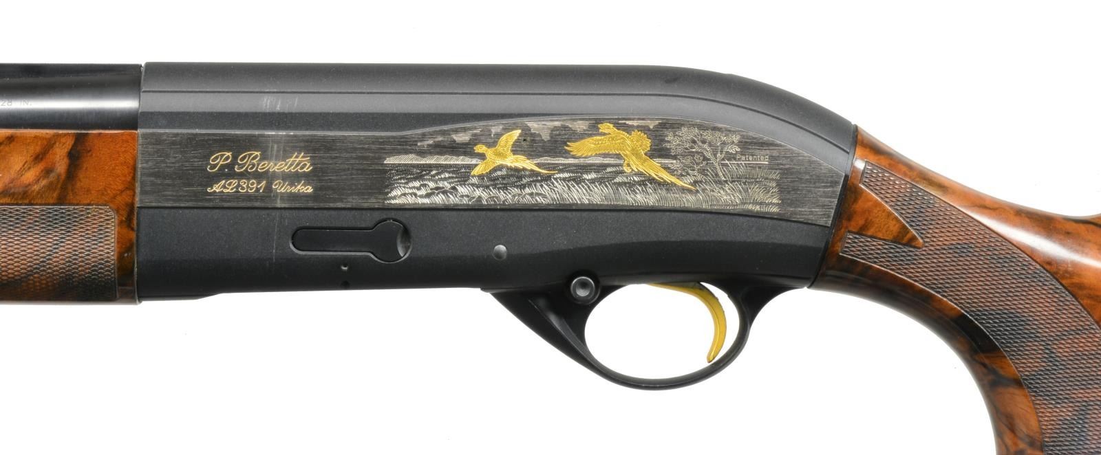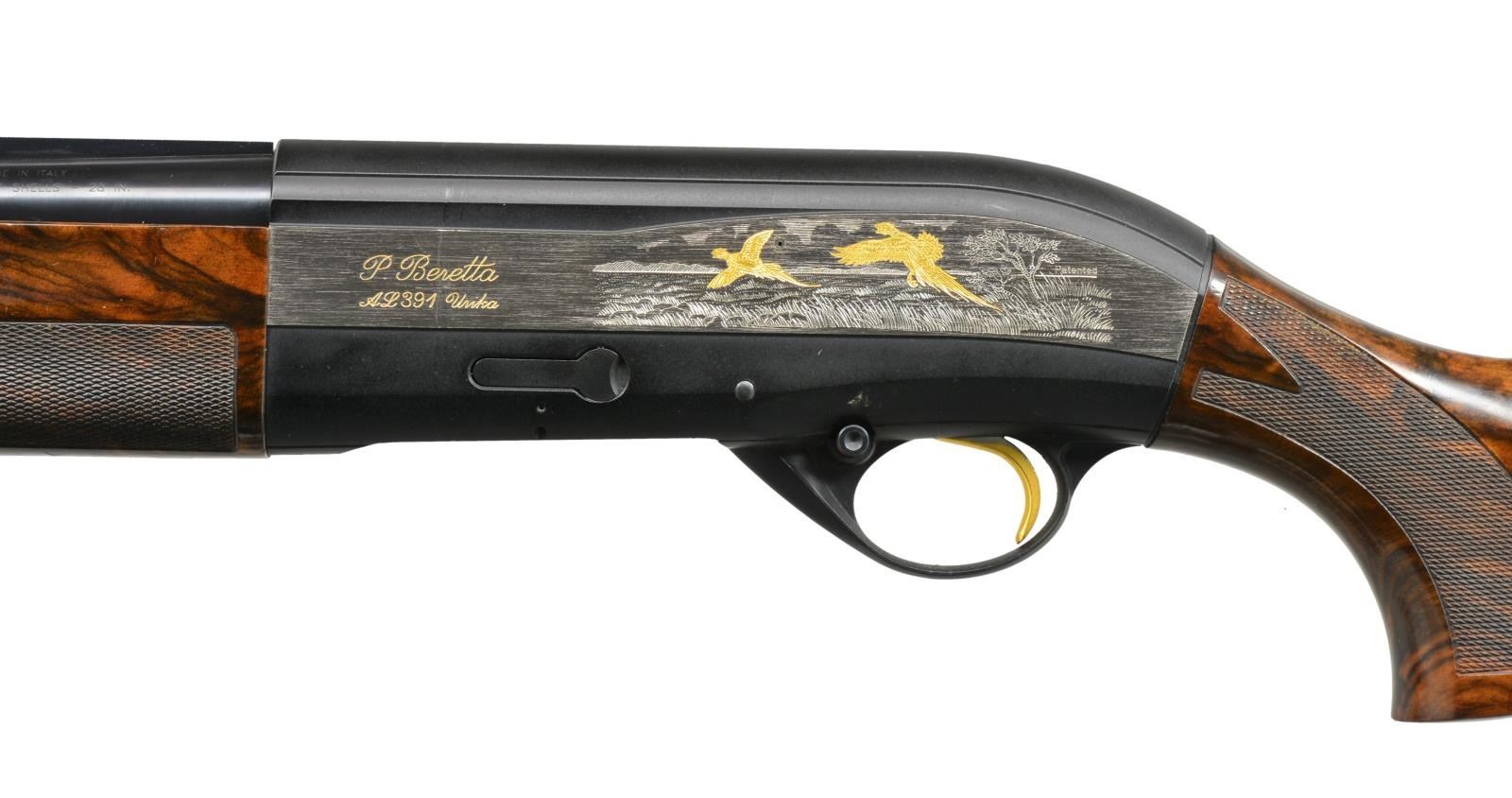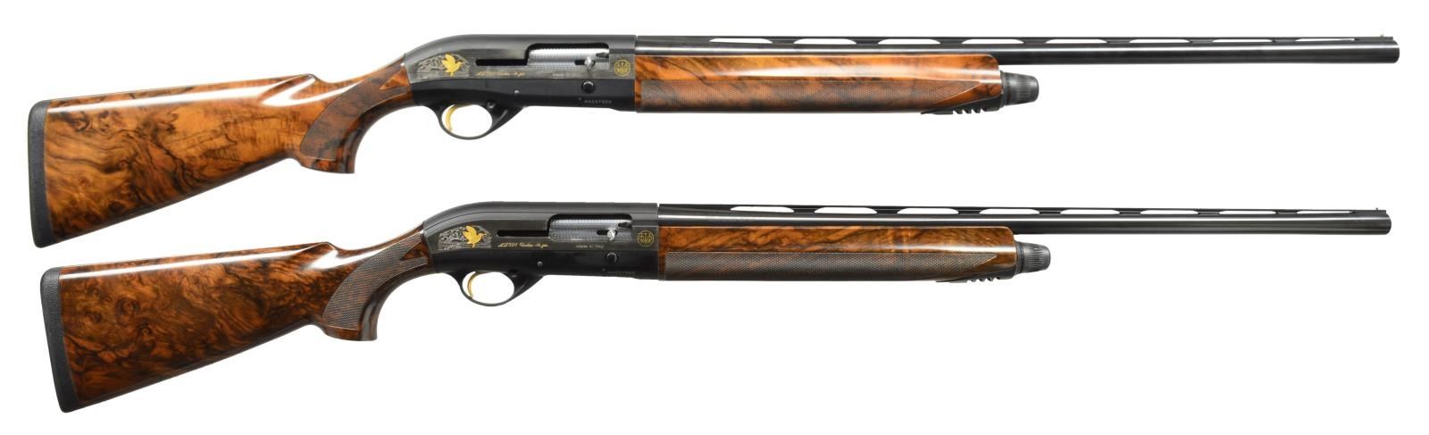 SHOTGUNS. 1) Cal. 12 Ga., 2 3/4" & 3". S# AA057859. Bbl. 28" VR w/ steel bead & fitted for Mobile chokes; Cyl., Imp. Cyl., Mod. & Imp. Mod. included. Left side of bbl. has inscription "Made Especially for Ken Behring". Matte black anodized alloy receiver w/ natural finished side panels having gold markings w/ game scenes having gold plated woodcock on right side & 2 flying pheasants on left side. Jeweled bolt & carrier. Gold finished trigger. Forearm & pistol grip buttstock of checkered fancy walnut having vivid marbling & dark streaking. LOP: 14 3/8" over solid black Beretta pad. UNATTACHED ACCESSORIES: blue molded case containing spare chokes, choke wrench, Beretta oil, stock shims, front sling swivel, buttplate, grip cap, plug, owner's manual & warranty information. CONDITION: bbl. & action retain over 95% finish. Action has series of scratches on left side. Wood finish shows scattered scratches & marks. Clean bright bore. (20-1174/DS). 2) Cal. 12 Ga., 2 3/4" & 3". S# AA057860. Bbl. 28" VR w/ steel bead & fitted for Mobile chokes; full set of 5 tubes included. Left side of bbl. has inscription "Made Especially for Ken Behring". Matte black anodized alloy receiver w/ natural finished side panels having gold markings w/ game scenes having gold plated woodcock on right side & 2 flying pheasants on left side. Jeweled bolt & carrier. Gold finished trigger. Forearm & pistol grip buttstock of checkered fancy walnut having vivid marbling & dark streaking. LOP: 14 3/8" over solid black Beretta pad. UNATTACHED ACCESSORIES: blue molded case containing spare chokes, choke wrench, Beretta oil, stock shims, sling swivels, buttplate, grip cap, plug, owner's manual & warranty information. CONDITION: over 97% metal finish w/ areas of scratches & wear on left side of action. Stock & forearm shows scattered scratches & handling marks. Clean bright bore. (20-1175/DS). BOTH MODERN. $1,400-2,000.