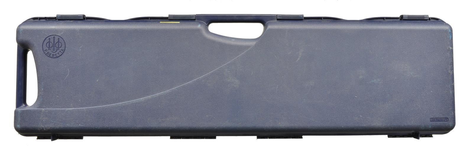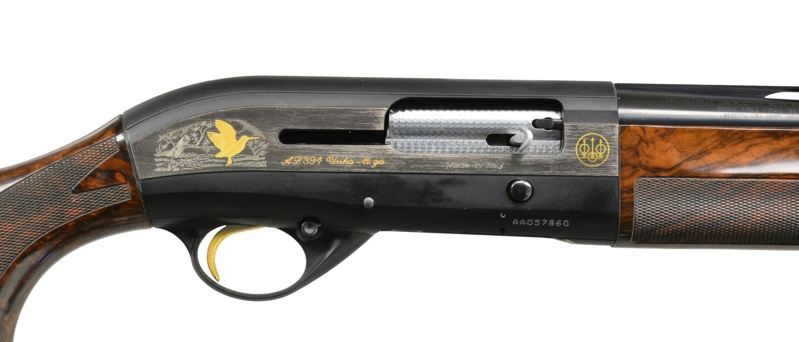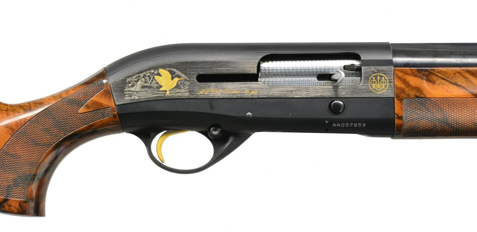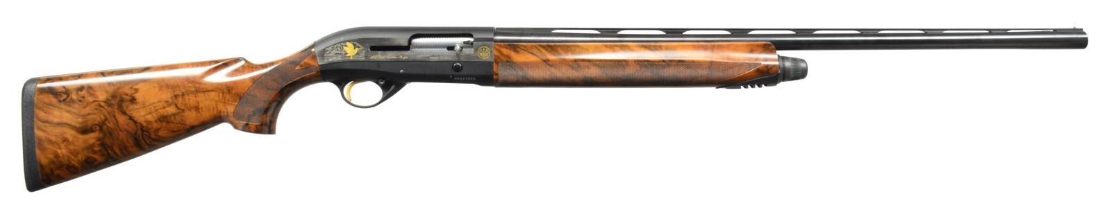 SHOTGUNS. 1) Cal. 12 Ga., 2 3/4" & 3". S# AA057859. Bbl. 28" VR w/ steel bead & fitted for Mobile chokes; Cyl., Imp. Cyl., Mod. & Imp. Mod. included. Left side of bbl. has inscription "Made Especially for Ken Behring". Matte black anodized alloy receiver w/ natural finished side panels having gold markings w/ game scenes having gold plated woodcock on right side & 2 flying pheasants on left side. Jeweled bolt & carrier. Gold finished trigger. Forearm & pistol grip buttstock of checkered fancy walnut having vivid marbling & dark streaking. LOP: 14 3/8" over solid black Beretta pad. UNATTACHED ACCESSORIES: blue molded case containing spare chokes, choke wrench, Beretta oil, stock shims, front sling swivel, buttplate, grip cap, plug, owner's manual & warranty information. CONDITION: bbl. & action retain over 95% finish. Action has series of scratches on left side. Wood finish shows scattered scratches & marks. Clean bright bore. (20-1174/DS). 2) Cal. 12 Ga., 2 3/4" & 3". S# AA057860. Bbl. 28" VR w/ steel bead & fitted for Mobile chokes; full set of 5 tubes included. Left side of bbl. has inscription "Made Especially for Ken Behring". Matte black anodized alloy receiver w/ natural finished side panels having gold markings w/ game scenes having gold plated woodcock on right side & 2 flying pheasants on left side. Jeweled bolt & carrier. Gold finished trigger. Forearm & pistol grip buttstock of checkered fancy walnut having vivid marbling & dark streaking. LOP: 14 3/8" over solid black Beretta pad. UNATTACHED ACCESSORIES: blue molded case containing spare chokes, choke wrench, Beretta oil, stock shims, sling swivels, buttplate, grip cap, plug, owner's manual & warranty information. CONDITION: over 97% metal finish w/ areas of scratches & wear on left side of action. Stock & forearm shows scattered scratches & handling marks. Clean bright bore. (20-1175/DS). BOTH MODERN. $1,400-2,000.