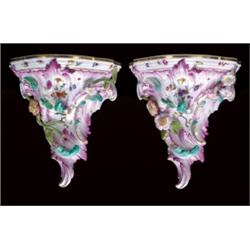 PAIR OF BERLIN ROCAILLE WALL BRACKETS, moulded with pink, green and gilt, scrollwork and applie...