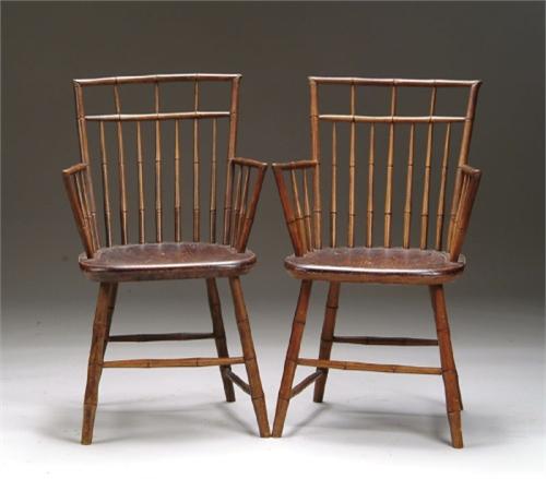 PAIR OF BIRDCAGE WINDSOR ARMCHAIRS. Bamboo style turnings, seven spindle back with two spindles under arms. Carved pine seat, good tall legs. SIZE: 34in. h x 17-1/2in. seat h. CONDITION: Very good. 9-26539
