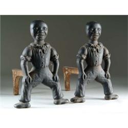 PAIR OF BLACK ANDIRONS. Heavily cast iron andirons depicting spread legged standing black farmers with exaggerated features. SIZE: 19" t. x 18" d. CONDITION: Generally good to very good. 1-3697 (150-300)