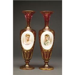 PAIR OF BOHEMIAN, OVERLAID GLASS PORTRAIT VASES, of red and clear glass decorated with gilt fol...