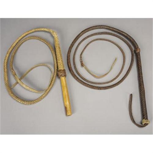 <B>PAIR OF BRAIDED WHIPS</B></I> - <BR> a) Rawhide wagon whip; 8' overall with 20” popper and exposed wood handle; <BR> b) Leather, 8' overall bull whip<BR><BR><B>Condition:</B></I> Fair to Good.<BR><BR><b>Shipping:</b> Miscellaneous Collectibles, Larg (<a target="_blank" href="http://www.heritageauctions.com/common/shipping.php">view shipping information</a>)