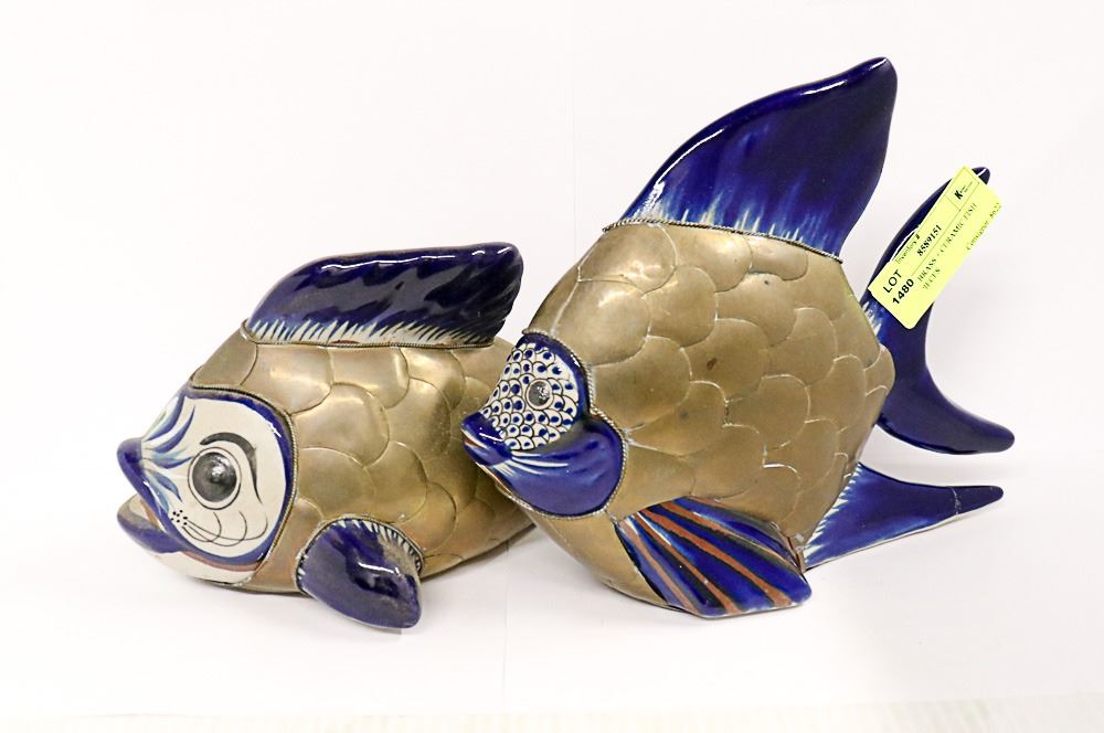PAIR OF BRASS + CERAMIC FISH DECOR PIECES