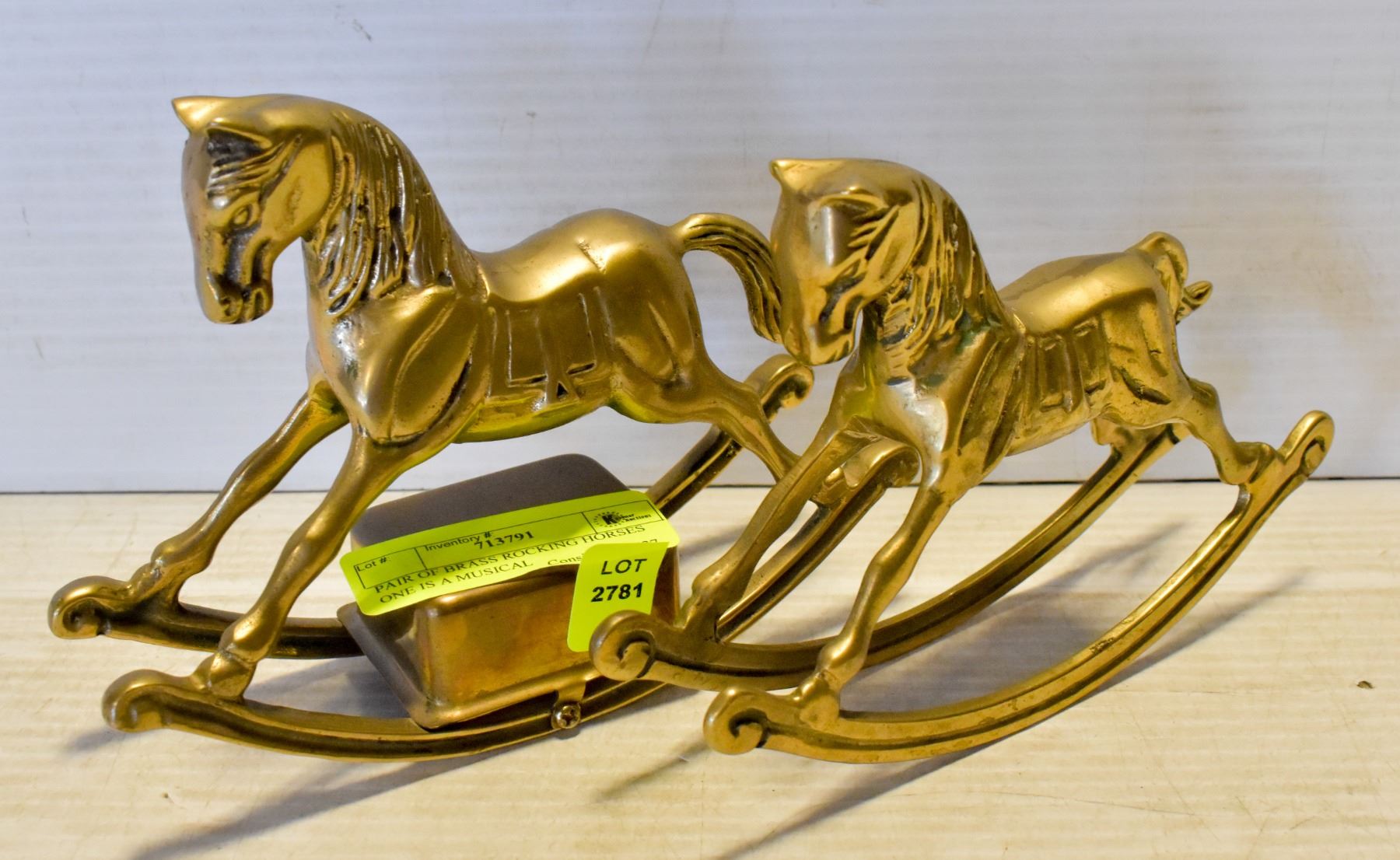 PAIR OF BRASS ROCKING HORSES ONE IS A MUSICAL