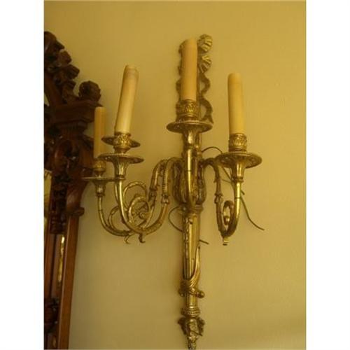 This is a very decorative pair of five armed Louis the xv th style bronze sconces, circa 1890. The sconces are in excellent condition all rewired and the matching candle covers are available at no charge.