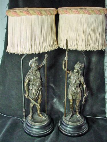 PAIR OF BRONZE VICTORIAN FIGURAL LAMPS DEPICTING A CENTURION MAN WITH ORIGINAL SILK FRINGED SHADES. BOTH CARRYING WEAPONS OF THE TIME. 21.5" X 6.5" BASE.RARE.