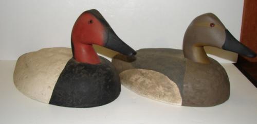 PAIR OF CANVASBACK DECOYS. Flat bottom. Drake is signed on bottom “Jack Williar & Tim Urse”.