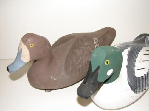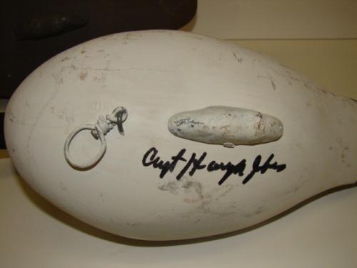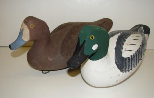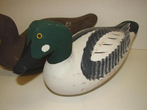 PAIR OF CAPTAIN HARRY JOBES GOLDENEYE DECOYS. Consists of drake and hen. Both have original paint. Both show signs of scuffing to paint. Both have lead weights at bottom. Drake is signed on bottom "Capt. Harry Jobes".