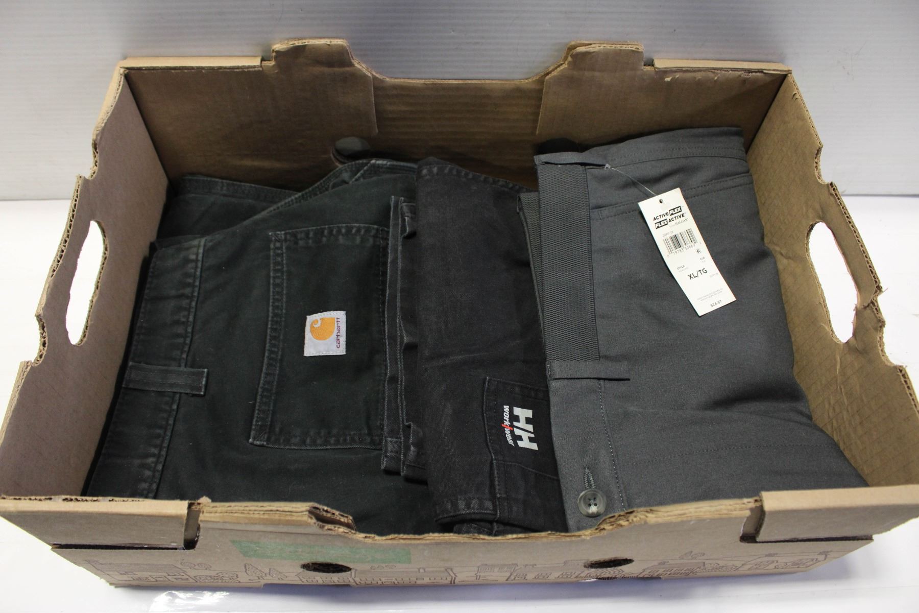 WAIST), PAIR OF HELLY HANSON BLACK WORK PANTS (38" WAIST) AND NEW PAIR OF ACTIVE FLEX GREY SHORTS (XL)