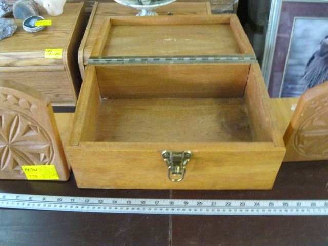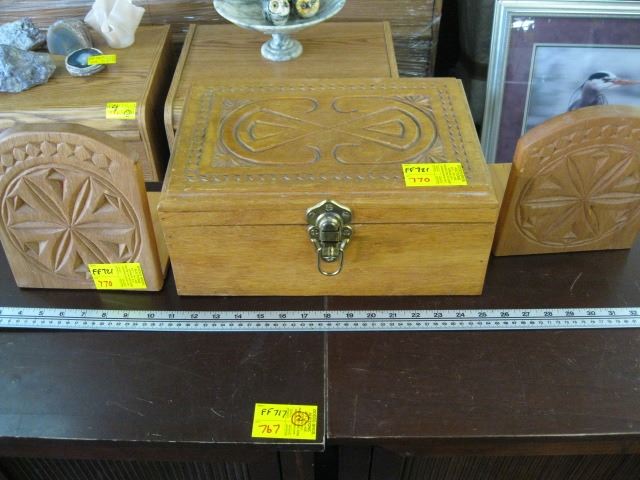 PAIR OF CARVED BOOK ENDS & A WOODEN CARVED BOX