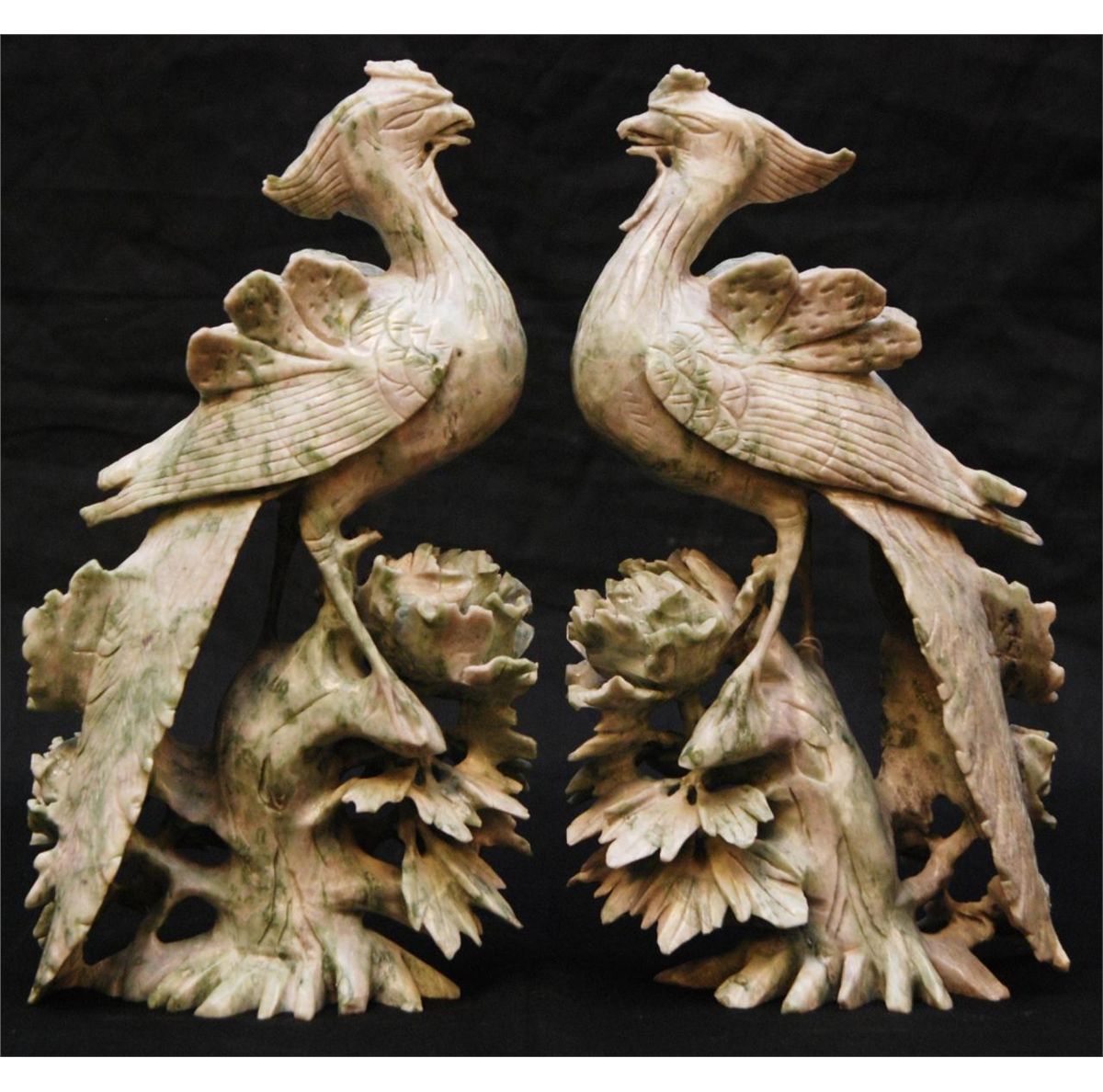 Pair of carved hard stone phoenix bird figures. Each is standing on stump with flowers. Each measures approx. 11 1/4" height (28.5cm). Total weight of approx. 3186 grams.