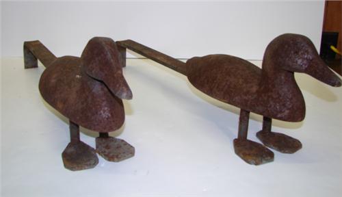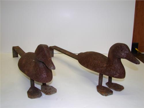 PAIR OF CAST IRON DECOY ANDIRONS. Good condition. 8.5”H, 26” total length.