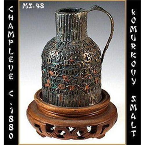 Beautiful pair of antique champleve pitchers. One pitcher is with wood stand, other without stand. Dimensions approx. : 2.5 inches high (without the stand), China late 19th century.
