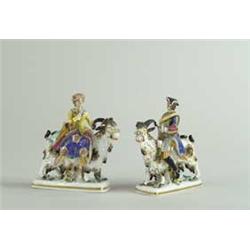 Lot 289 PAIR OF CHELSEA PORCELAIN FIGURES OF MAN AND WOMAN ON GOATPAIR OF CHELSEA PORCELAIN FIGURES OF MAN AND WOMAN ON GOAT. Each figurine has goat with horns wearing eyeglasses. Gold anchor mark to side. Very well mottled and detailed. Man and woman have colorful costumes on rectangular bases. SIZE: 6-3/4” h x 6” l. CONDITION: Man is missing right arm and goat missing right ear. Right thumb of woman missing. Otherwise good. 12-48 (300-500)