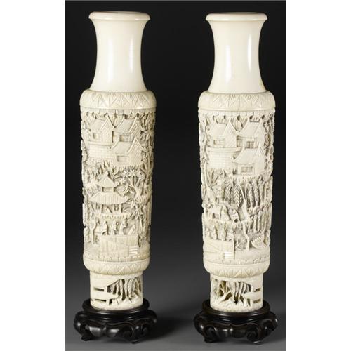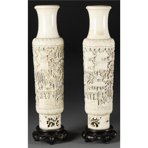 <B>PAIR OF CHINESE CARVED IVORY VASES</B></I><BR>Late Nineteenth/Early Twentieth Century<BR>Ivory<BR>Unmarked<BR>Each 11-1/4in. high<BR><BR>Pair of Chinese carved ivory vases with long waited necks and depicting pavilions, figures, land and seascapes on the body, above reticulated feet, on wood stands<BR><BR> <B>Condition Report:</B> Normal signs of wear as appropriate with age.<BR><BR><b>Shipping:</b> Hollowware/Pottery/Glass, Small (<a target="_blank" href="http://www.heritageauctions.com/common/shipping.php">view shipping information</a>)