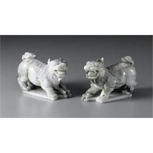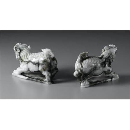 <B>PAIR OF CHINESE CARVED JADE/HARDSTONE FIGURES</B></I><BR><BR>Pair of Chinese carved jade/hardstone figures, one of a qilin and one of a lion. Of pale green coloration with spinach green suffusions<BR>Each 3-1/4in. high x 5in. long<BR><BR> <B>Condition Report:</B> Normal signs of wear as appropriate with age.<BR><BR><b>Shipping:</b> Miscellaneous Collectibles, Larg (<a target="_blank" href="http://www.heritageauctions.com/common/shipping.php">view shipping information</a>)