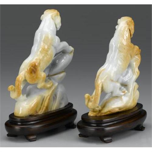 <B>PAIR OF CHINESE JADE/HARDSTONE LIONS</B></I><BR><BR>Pair of Chinese carved jade/hardstone figures of lions climbing atop rockery. Of pale green coloration with rust suffusion. Each on a wood stand<BR>5-1/4in. high<BR><BR> <B>Condition Report:</B> Normal signs of wear as appropriate with age.<BR><BR><b>Shipping:</b> Miscellaneous Collectibles, Larg (<a target="_blank" href="http://www.heritageauctions.com/common/shipping.php">view shipping information</a>)