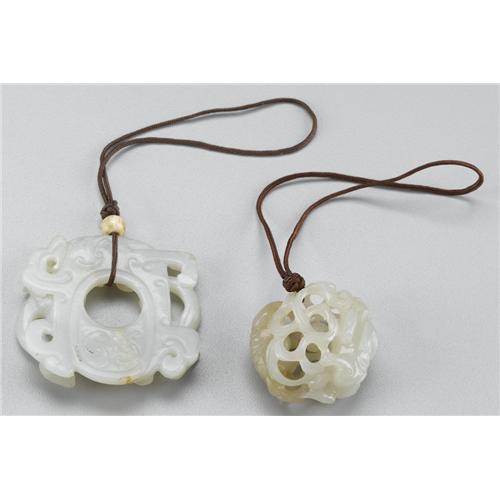 <B>PAIR OF CHINESE JADE/HARDSTONE PENDANTS</B></I><BR><BR>Pair of Chinese carved jade/hardstone pendants; one with openwork designs depicting chilongs and bead to interior, one bi with chilongs. Of pale celadon coloration<BR>Largest: 2-1/4in. x 2.5in.<BR><BR> <B>Condition Report:</B> Normal signs of wear as appropriate with age; very minor loss to foot of one chilong.<BR><BR><b>Shipping:</b> Hollowware/Pottery/Glass, Small (<a target="_blank" href="http://www.heritageauctions.com/common/shipping.php">view shipping information</a>)
