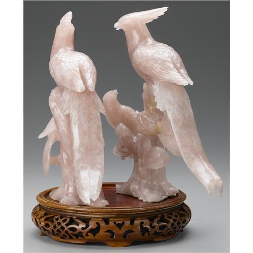 <B>CHINESE ROSE QUARTZ PHOENIX</B></I><BR><BR>Pair of Chinese carved rose quartz figures of phoenix perched on branches. Together on one wood stand<BR>Each 9in. high x 8in. wide<BR><BR> <B>Condition Report:</B> Loss to end of wings of one phoenix.<BR><BR><b>Shipping:</b> Hollowware/Pottery/Glass, Small (<a target="_blank" href="http://www.heritageauctions.com/common/shipping.php">view shipping information</a>)