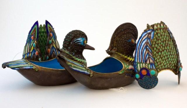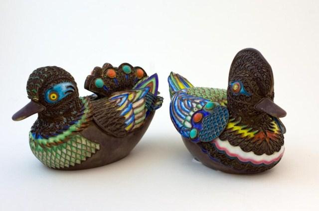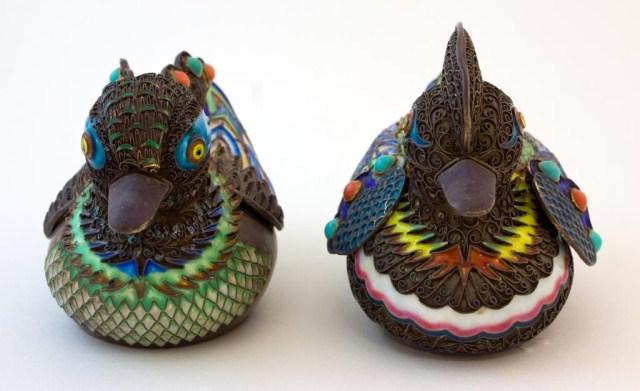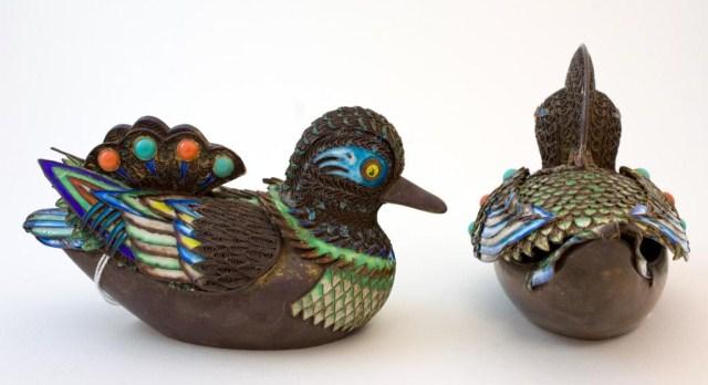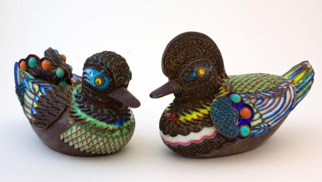 Beautiful pair of male and female ducks. They have a wonderful filigree design and vibrant enameling. Female has 8 rounded stones set on her feathers and the male has 6. The stones are 6 red coral and 8 turquoise. 6 1/4" length x 3 1/2" height.