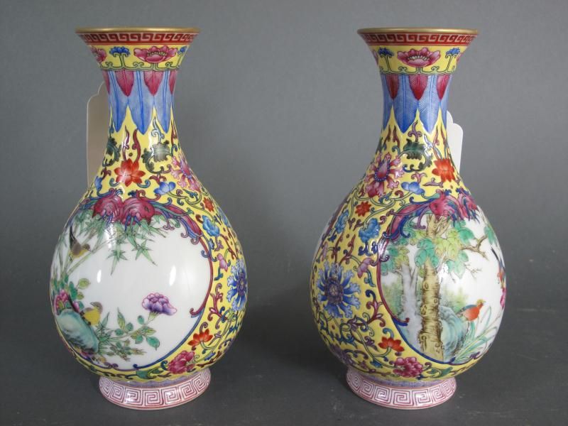 - each has tapered neck and bulbous base, decorated with ornithological scenes. Celadon interior.