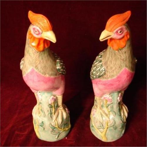 Circa 1890-1920 Pair of Mirror Imaging Chinese Export Ceramic/Porcelain Pheasants 10" in height in Excellent Condition with no chips, cracks or restoration. Very Decorative and Very Colorful. The pheasants are green with a pink rose colored chest with their feet and claws perched on a green flowery and tree formation bases. The underneath of the birds have the China Mark which would date them between 1891-1921. Additional images are available upon request.