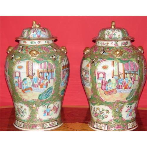 Circa 1800-1820 Pair of Chinese Export Rose Medallion/Rose Mandarin Covered Vases with melon panels and gold lions and foo dogs with lots of gilded gold decoration. These Vases are Absolutely Spectacular in Every and Any way that a true chinese export collector would be looking for. They measure 18 1/2" to the top of the gilded foo dog on each of the covers. EXCELLENT CONDITION AND FANTASTIC QUALITY in every way. NO RESTORATION. They are graced with four large melon panels in the middle with a court of ten people in each mandarin scene with plenty of gold in the hair. The covers also have four melon panels being in the rose medallion style with the panels having alternating scenes with people and garden scenes with a bird on a branch. Below the covers on the top of each vase are four mounted heads of lions or dogs of some kind. Towards the bottom are also four melon panels matching to the scenes on the covers. Below this are four quadrants encircled in black of two birds on a branch. This black border ususally means that they were made for the Boston Market.