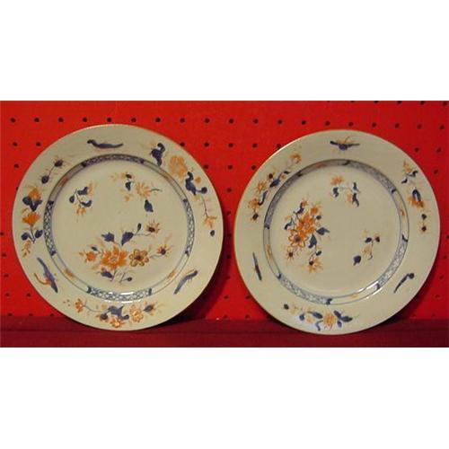 Circa 1740 Chinese Export Quianlong Period Pair of 9" Chinese Imari porcelain plates decorated in underglaze blue abd overglaze red and gold in the very typical imari style. This style was originally developed in Japan, after which it appeared on Chinese Export Porcelain at the end of the reign of Kangxi(1662-1722). These plates